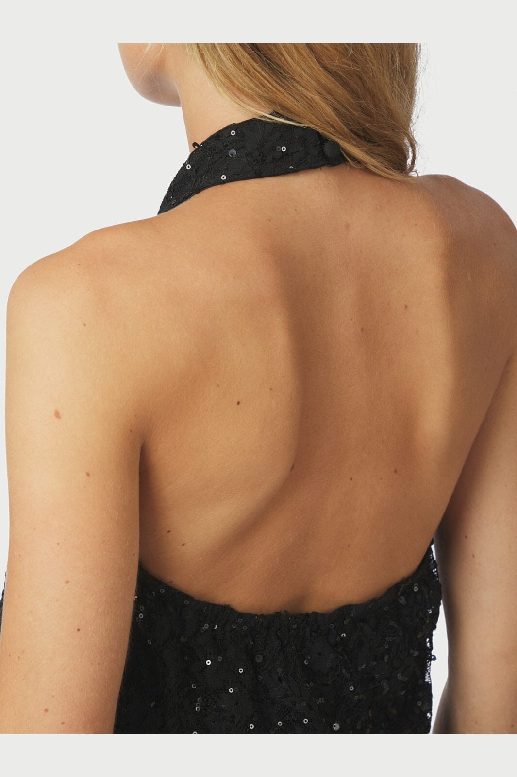 Robe de fête noire avec dentelle et paillettes de Neo Noir. La robe a un col haut en design halterneck et un dos ouvert. La partie supérieure ajustée se transforme en une jupe fluide.