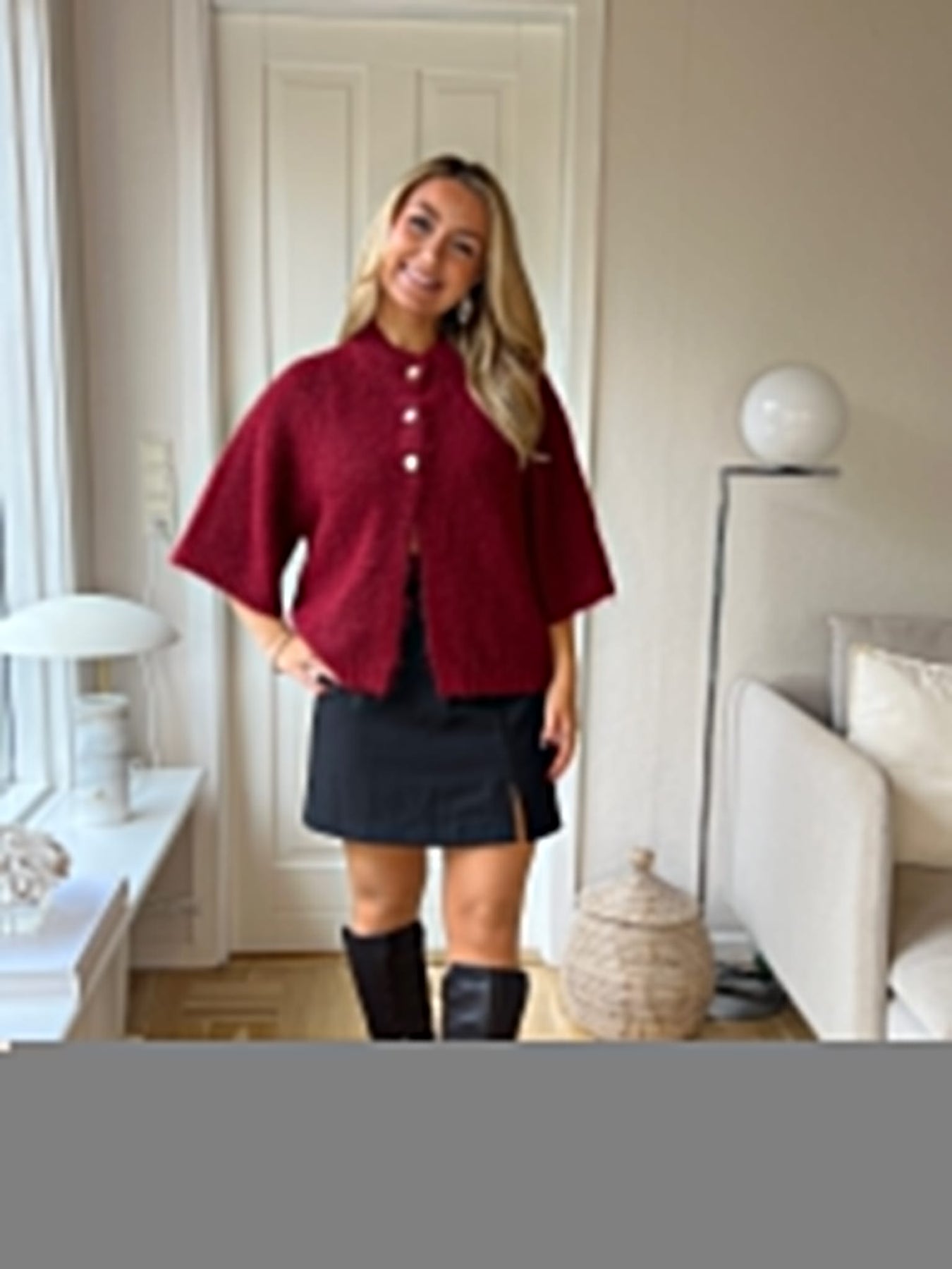 Cardigan rouge foncé de Neo Noir avec une texture tricotée duveteuse. La coupe ample avec des manches courtes et un col haut offre une grande liberté de mouvement pour le quotidien comme pour les fêtes.