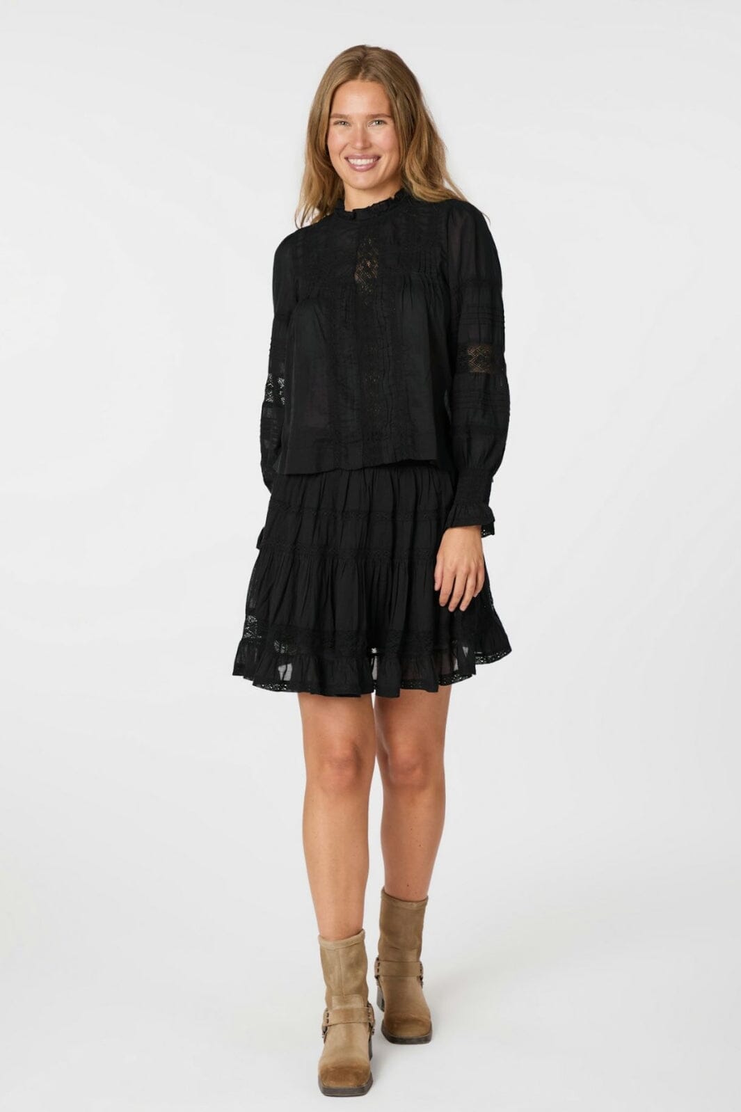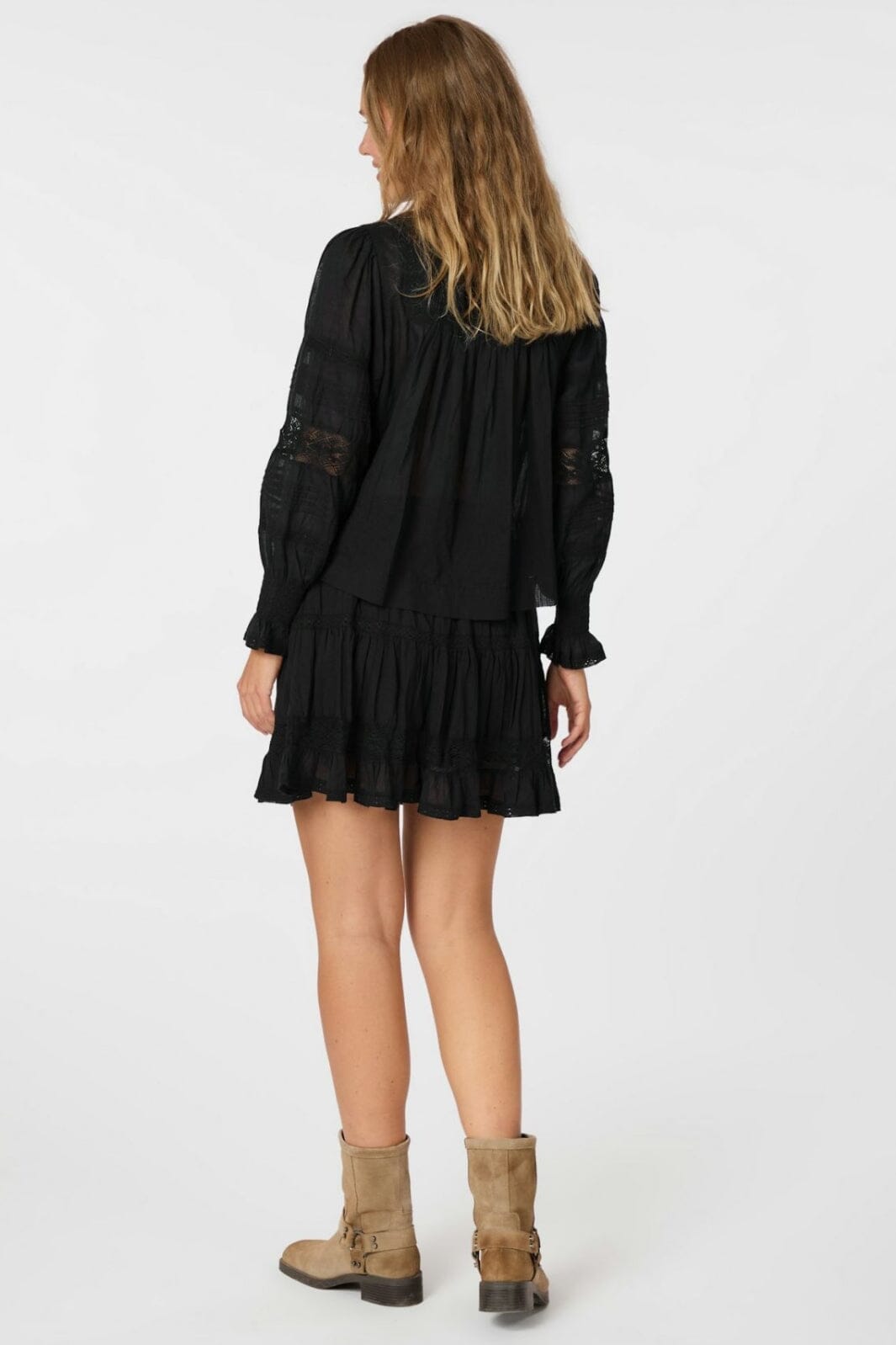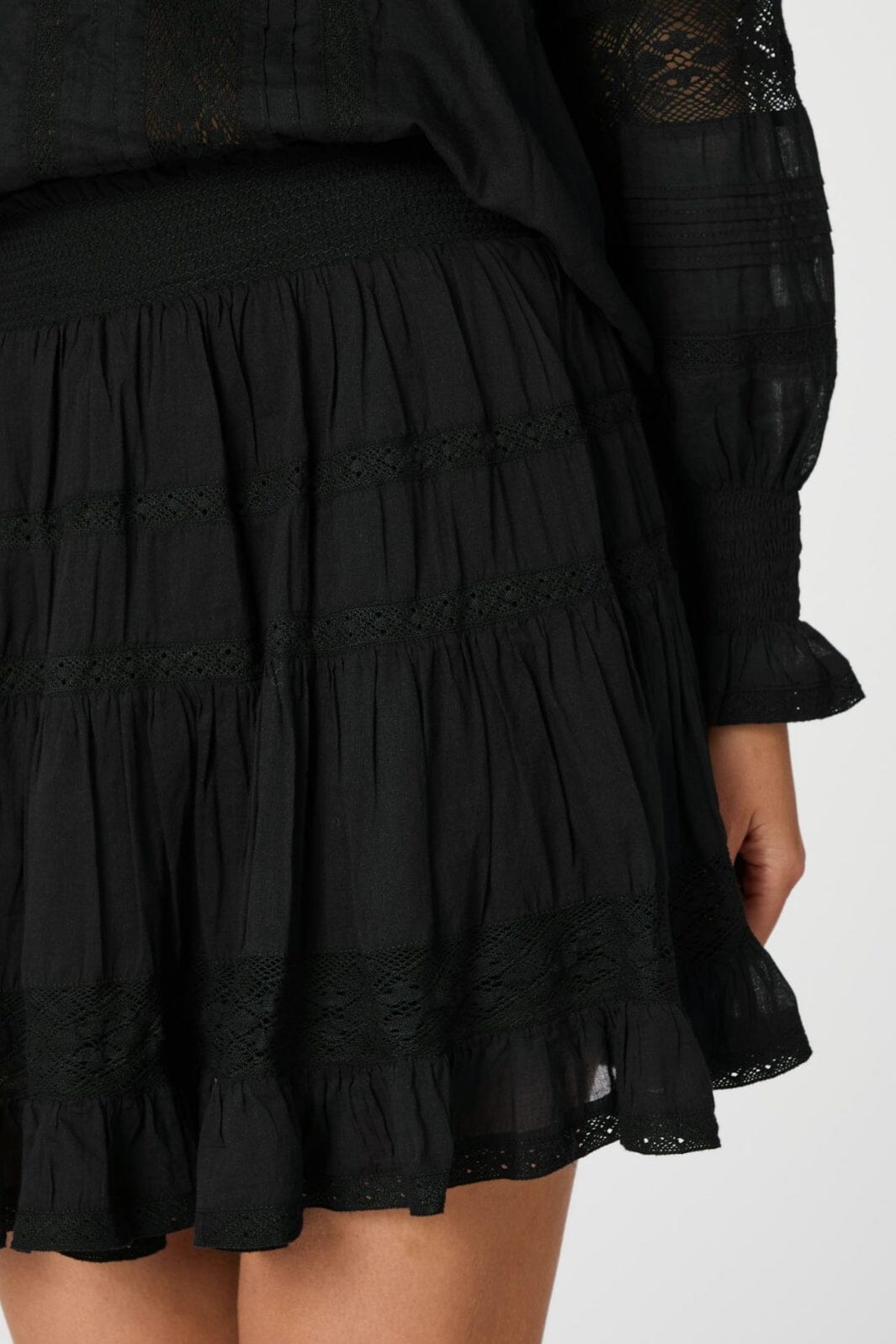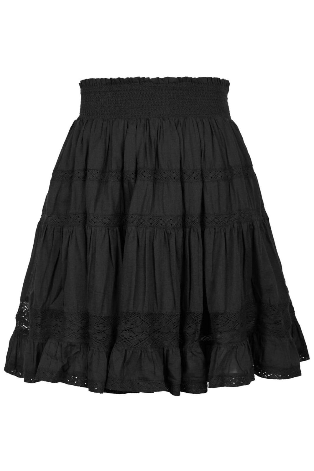 Jupe en voile noire avec dentelle et volants. La taille haute avec smock offre un bon ajustement, et le voile de coton crée un look léger et aérien.