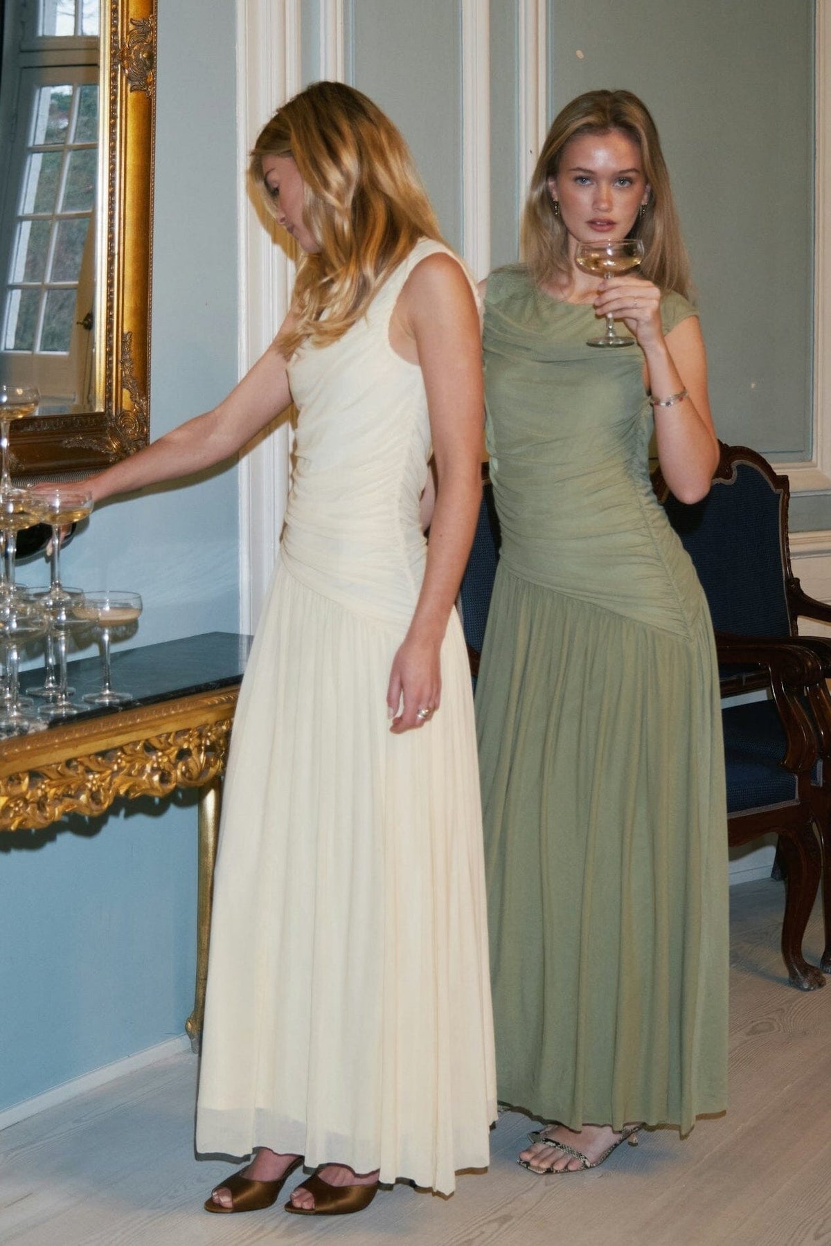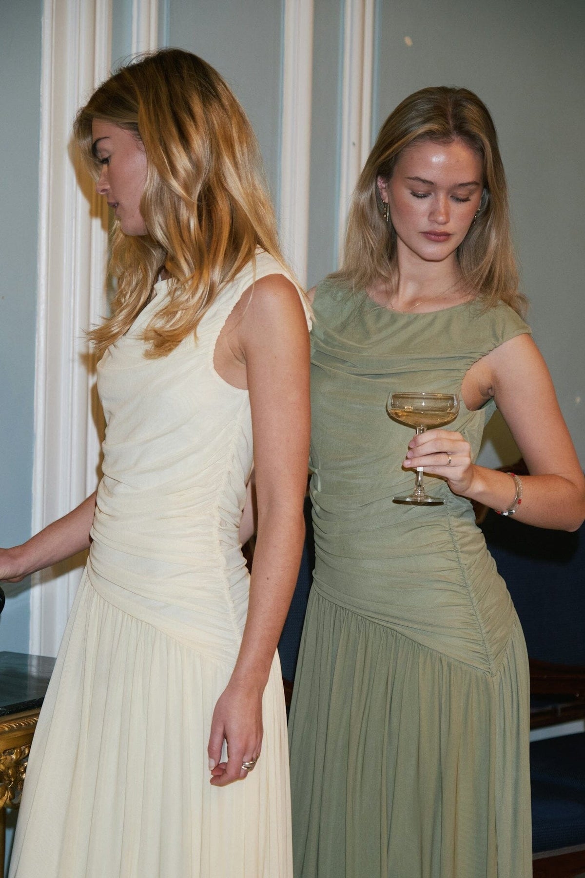 Robe en mesh de Neo Noir dans une couleur vert sauge. La robe présente des fronces le long de la couture latérale et une sous-robe ample avec une jupe coupée de façon asymétrique.