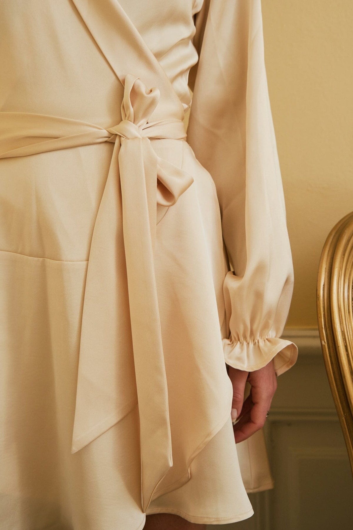 Robe courte Neo Noir en satin lourd dans une teinte jaune clair. La robe présente un décolleté en V, des manches longues et une coupe portefeuille avec lien à nouer.