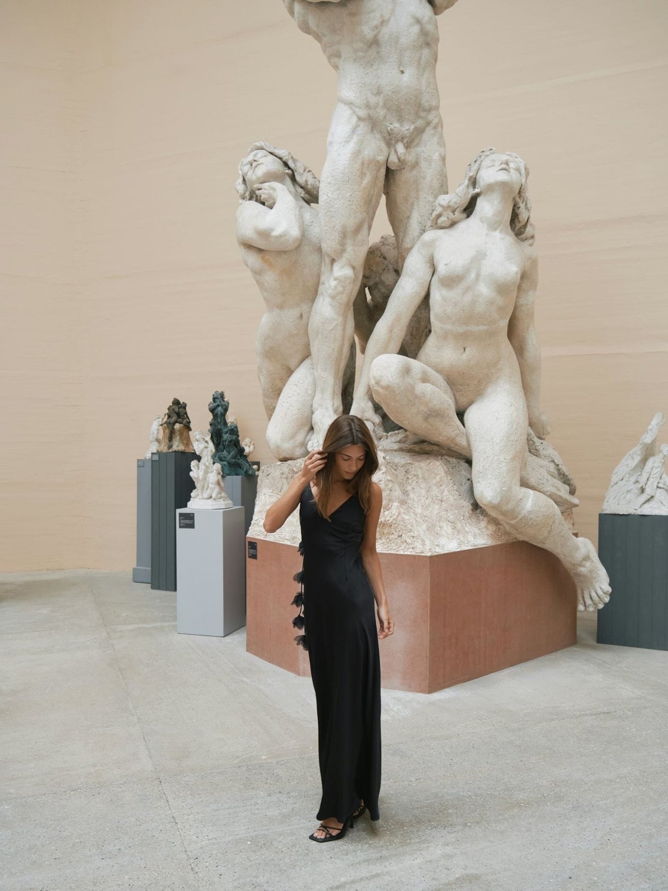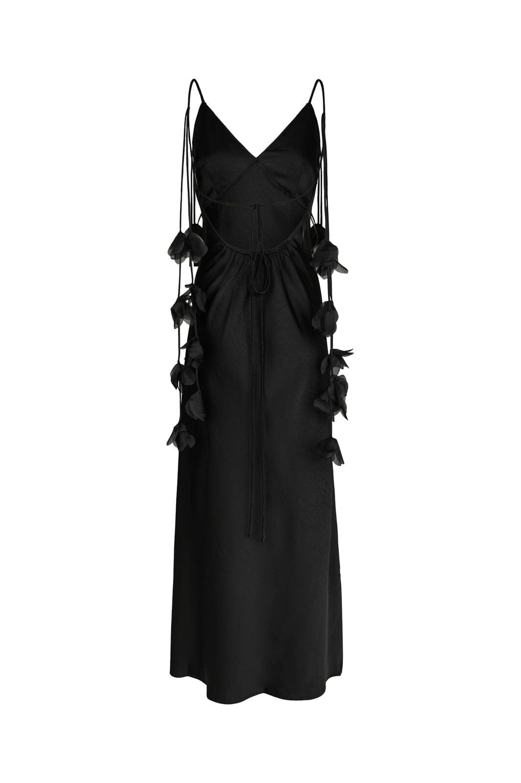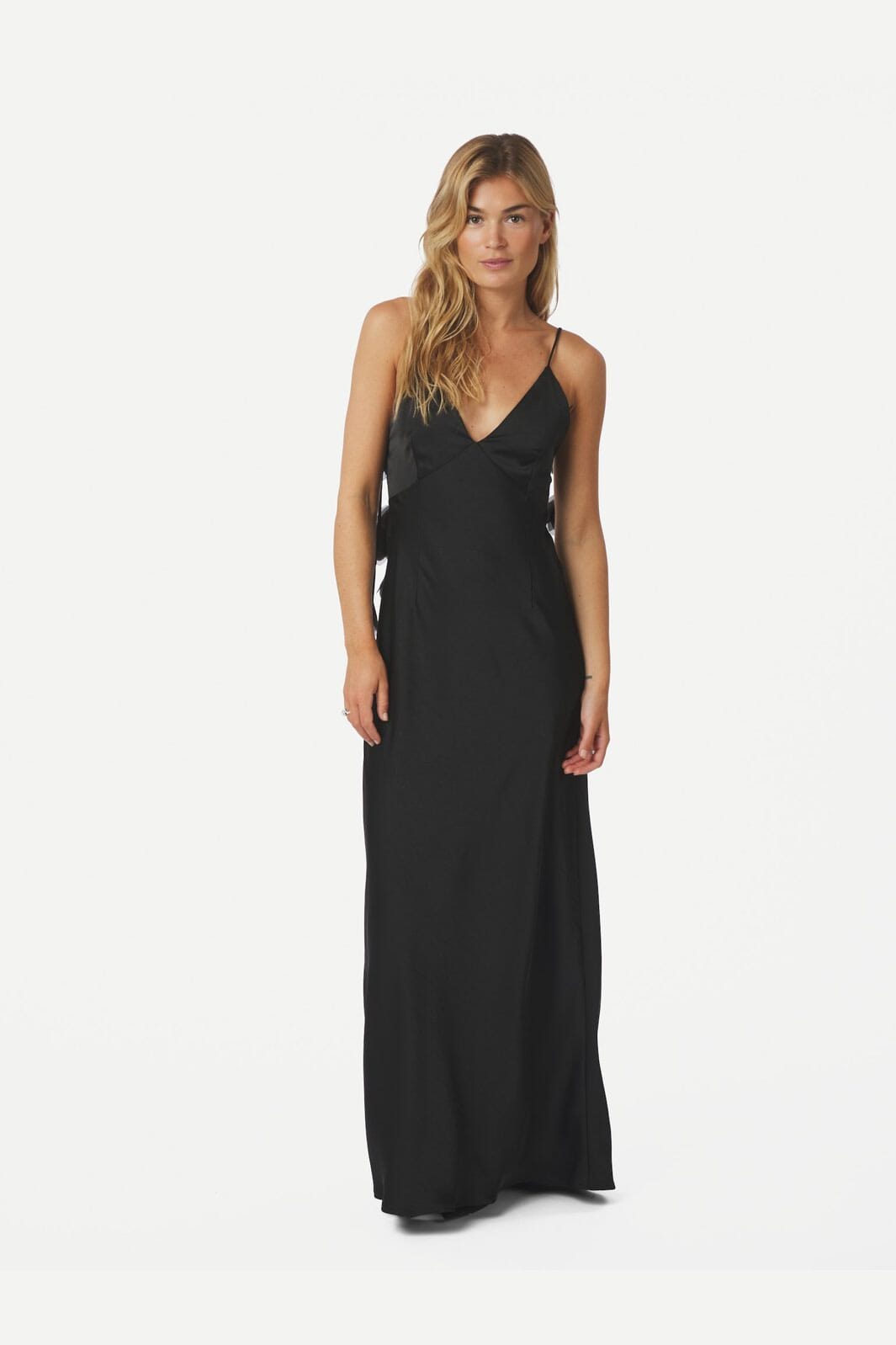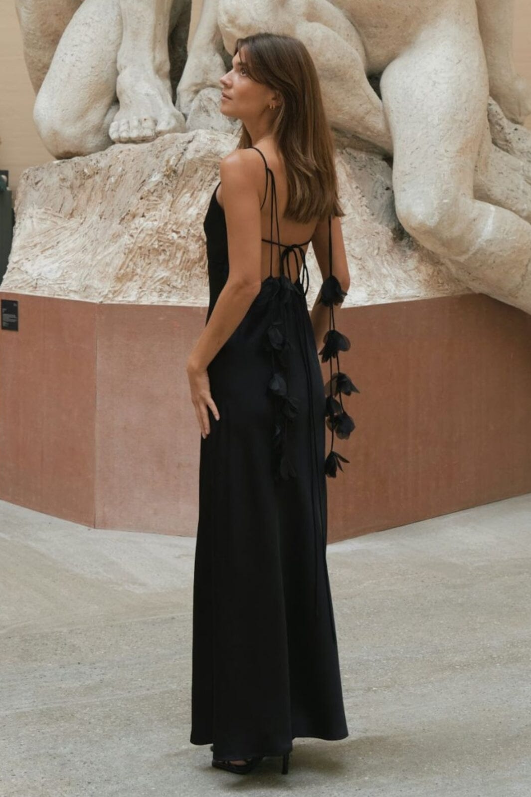 Robe noire longue au sol de Neo Noir en crépe satin lourd. La robe a un décolleté en V, des bretelles spaghetti avec des détails floraux et un lien dans le dos.