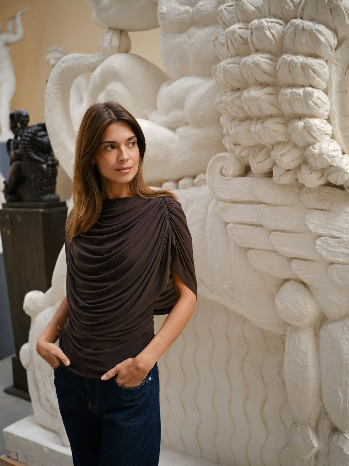 Top en mesh brun de Neo Noir avec un design drapé. Le haut a un tissu transparent avec des détails froncés le long de la couture latérale et un drapé à l'avant.