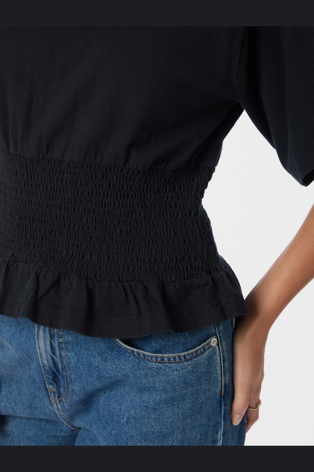 T-shirt bleu marine de Neo Noir avec coupe boxy et détail smock à la taille. Il est fabriqué en coton doux et possède des manches courtes ainsi qu'un col rond.