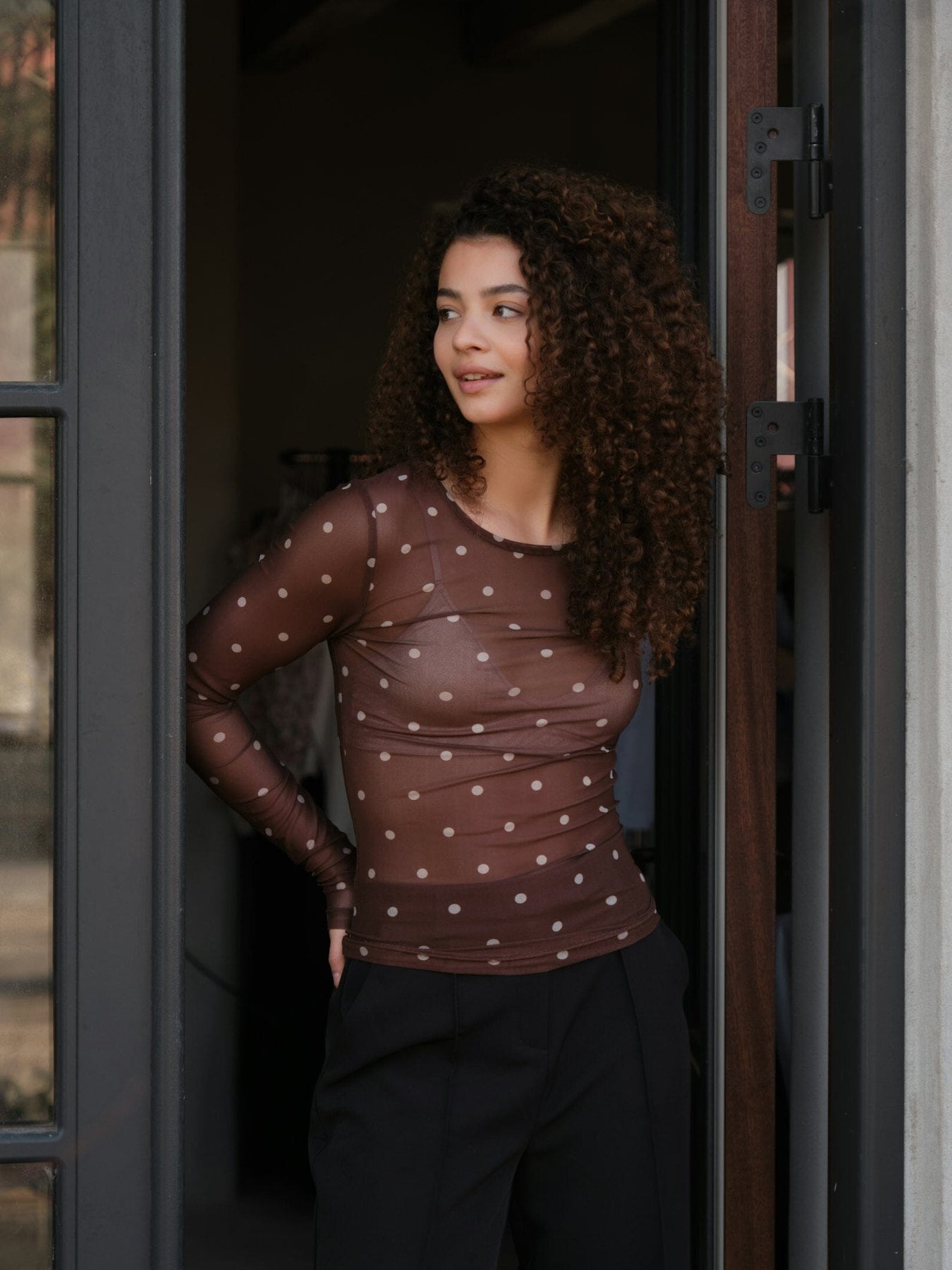 Blouse en mesh marron de Neo Noir avec un motif à pois. La blouse est semi-transparente et possède des manches longues avec une encolure ronde.