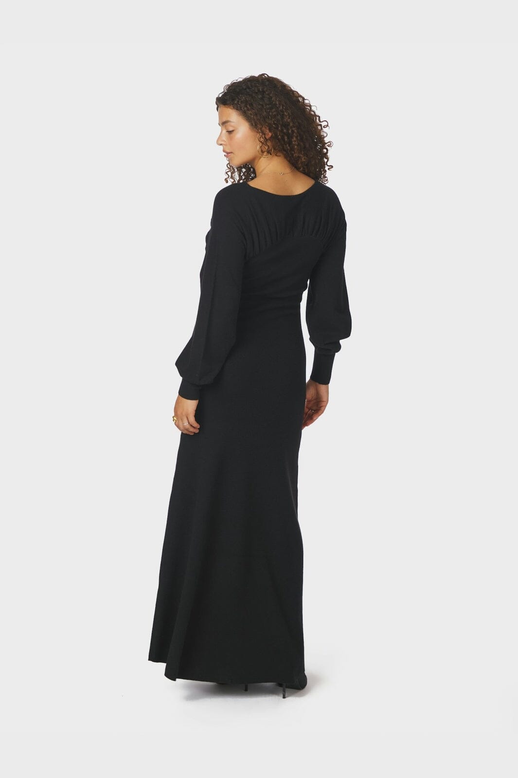 Robe tricotée noire de Neo Noir avec détail froncé au niveau de l'encolure. La robe a des manches larges et une légère ampleur en bas, ce qui offre une bonne liberté de mouvement.