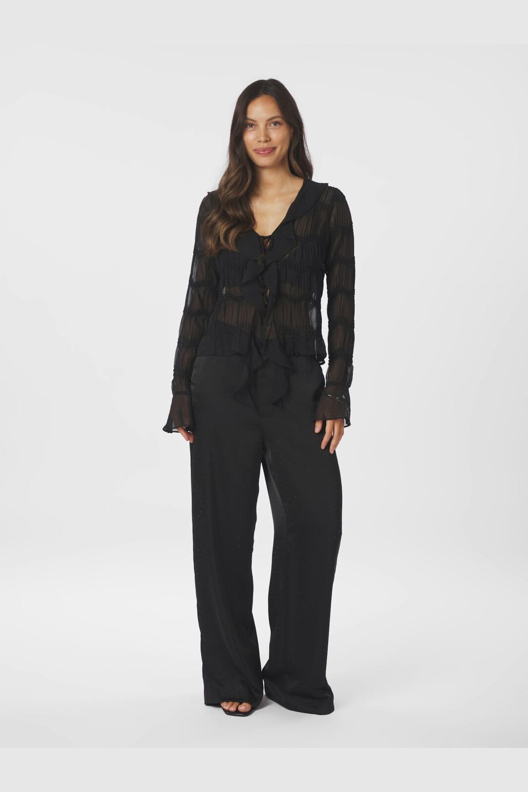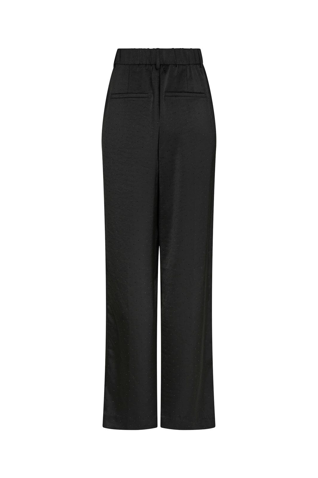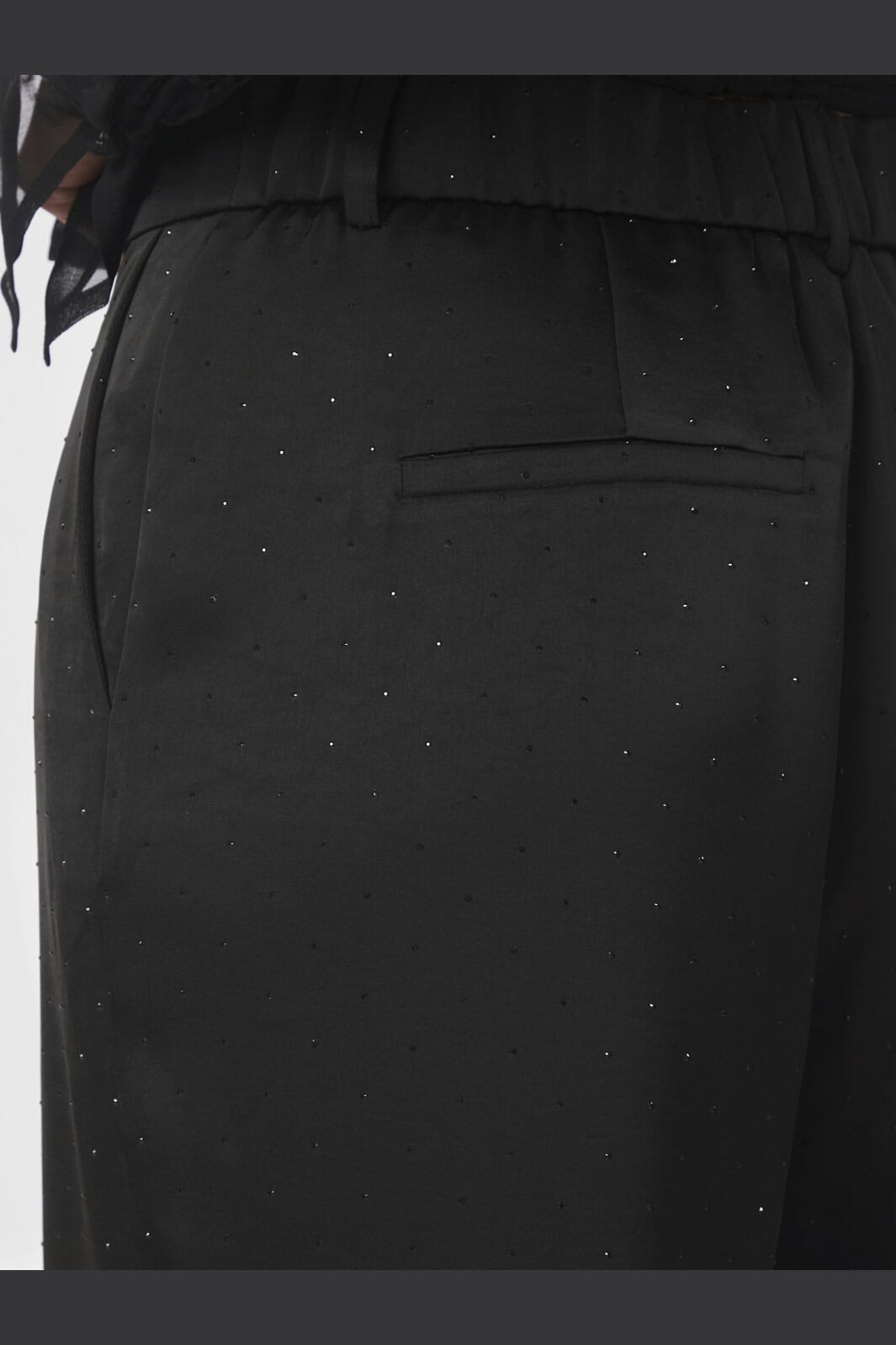 Pantalons noirs de Neo Noir en satin lourd avec des pierres cousues. Les pantalons ont une taille haute et une coupe large qui descend jusqu'au sol.