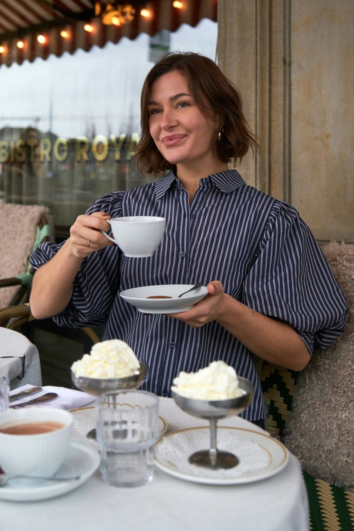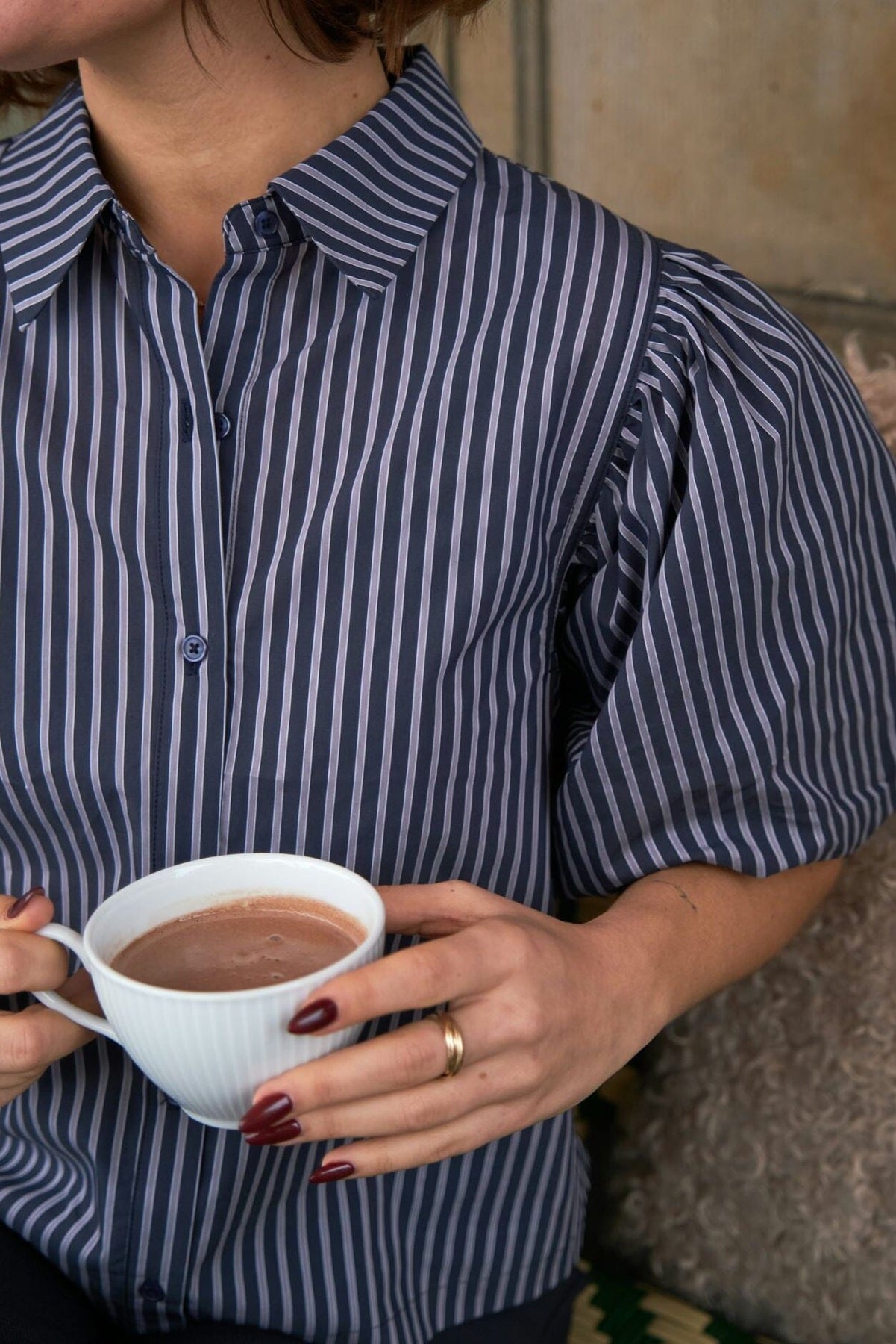 Chemise rayée bleu marine de Neo Noir avec des manches courtes bouffantes. La chemise a des rayures verticales en bleu marine et blanc, un col de chemise classique et une fermeture à boutons à l'avant.