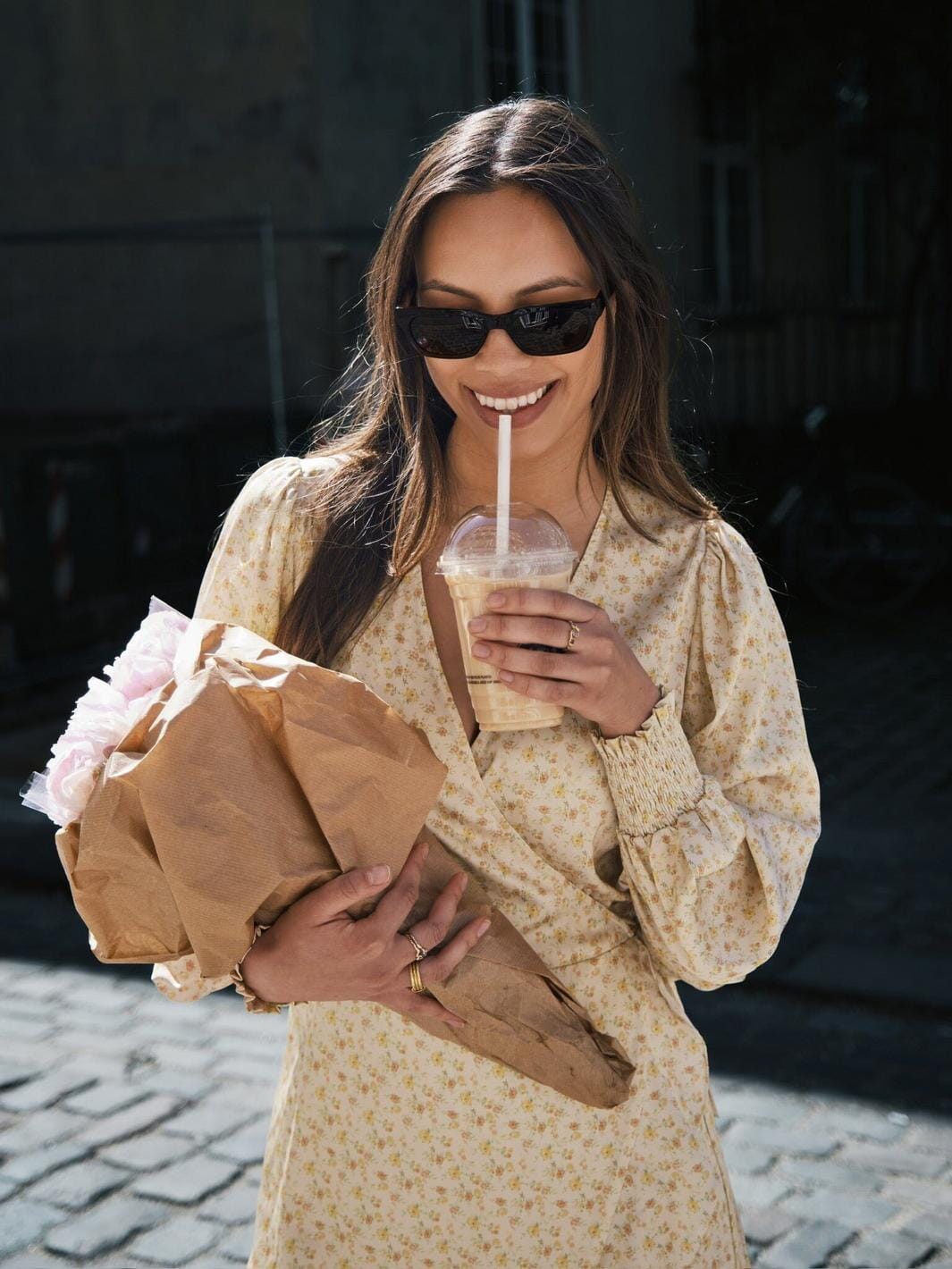 Robe portefeuille à fleurs de Neo Noir en jaune poussiéreux. La robe a des volants et un lien à la taille qui permet d'ajuster la coupe. Les manches longues ont des détails smock.