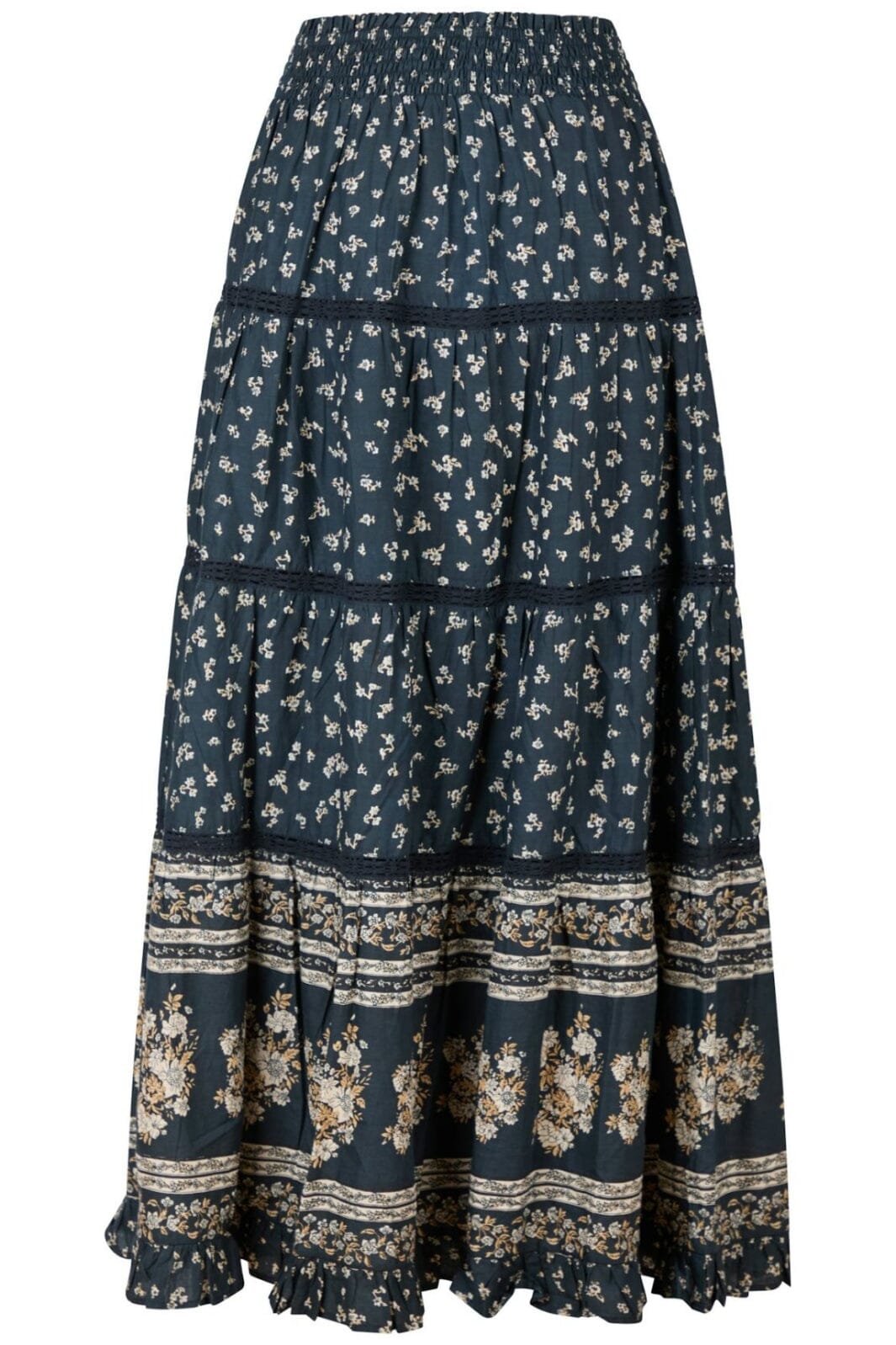 Jupe longue à la cheville de Neo Noir en camel avec dentelle et volants. La jupe a un motif floral et est conçue avec plusieurs couches qui lui donnent une chute aérienne.