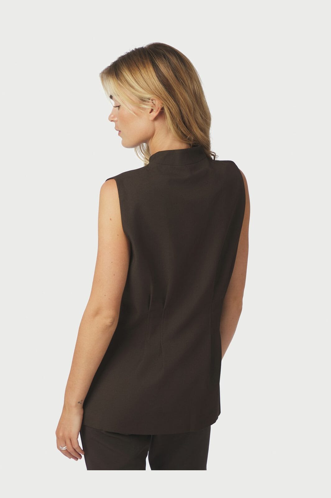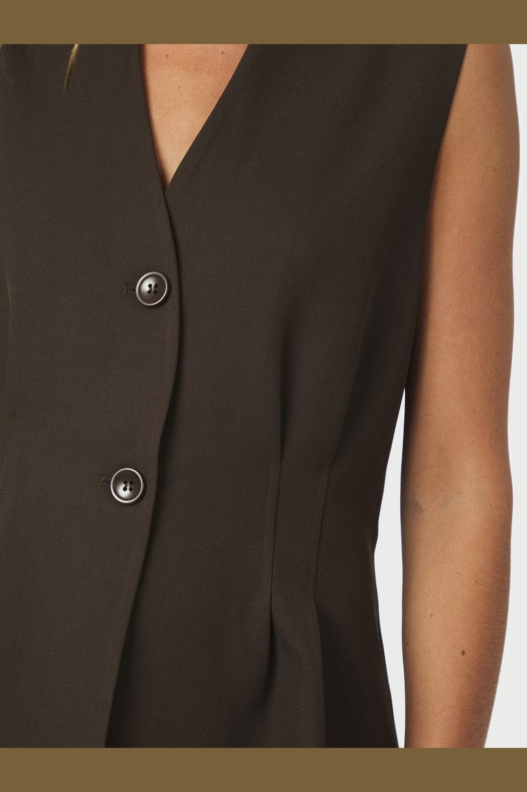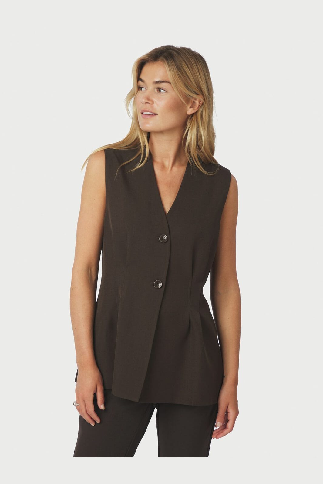 Gilet marron foncé de Neo Noir en qualité structurée. Le gilet ajusté a un décolleté en V et deux boutons à l'avant. Le gilet peut être porté aussi bien au quotidien qu'en soirée.