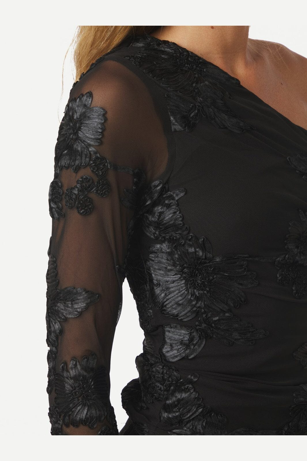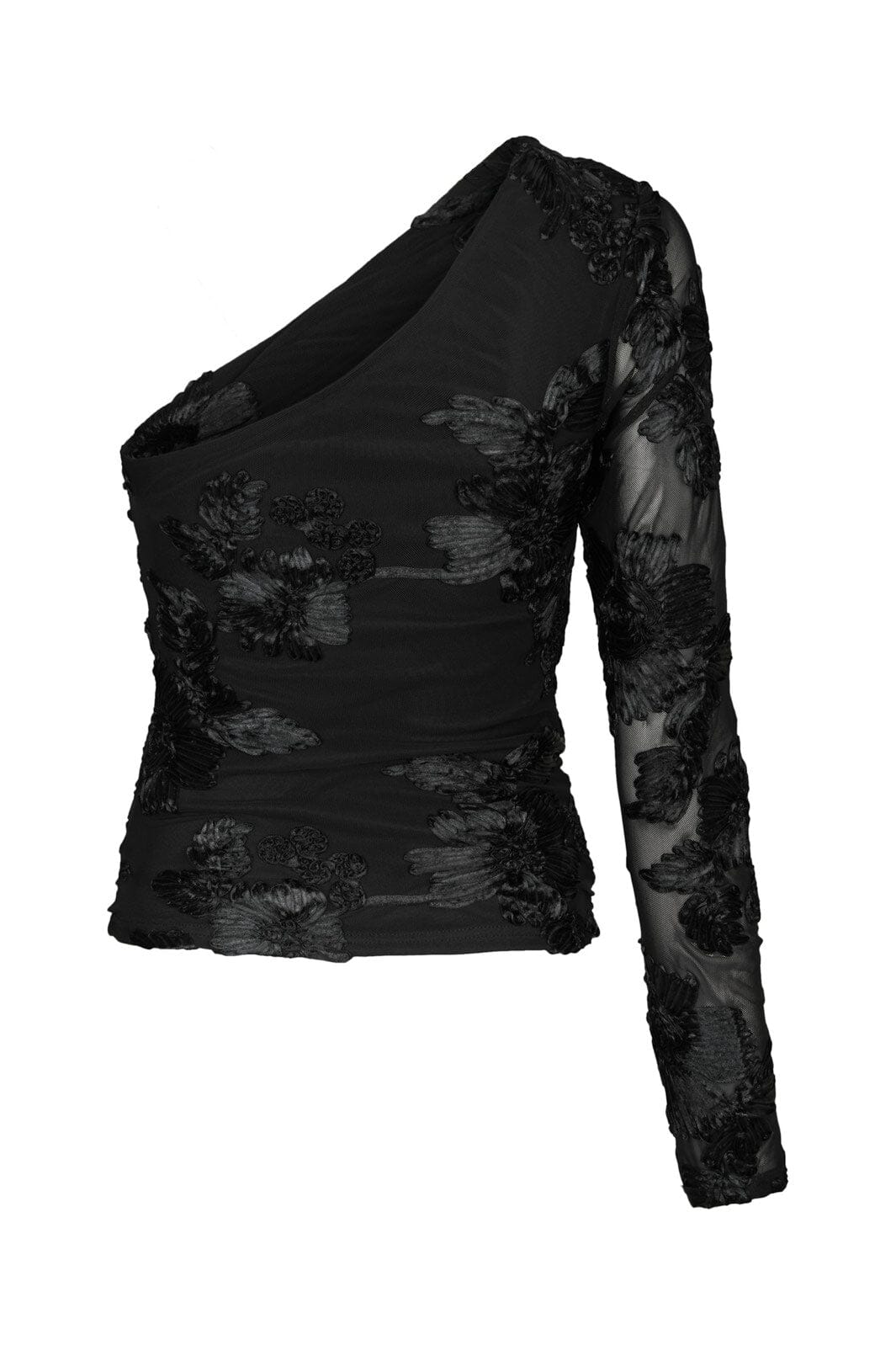 Blouse en mesh noire de Neo Noir avec broderie florale. La blouse a un design à une épaule avec effet froncé et une longue manche en mesh. Des fleurs brodées ornent à la fois le devant et la manche.