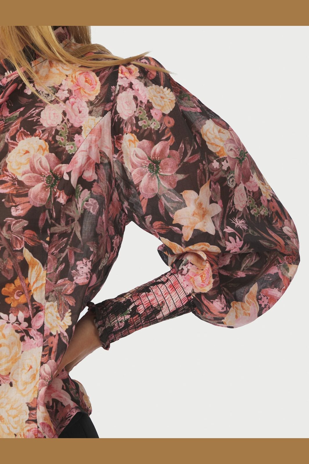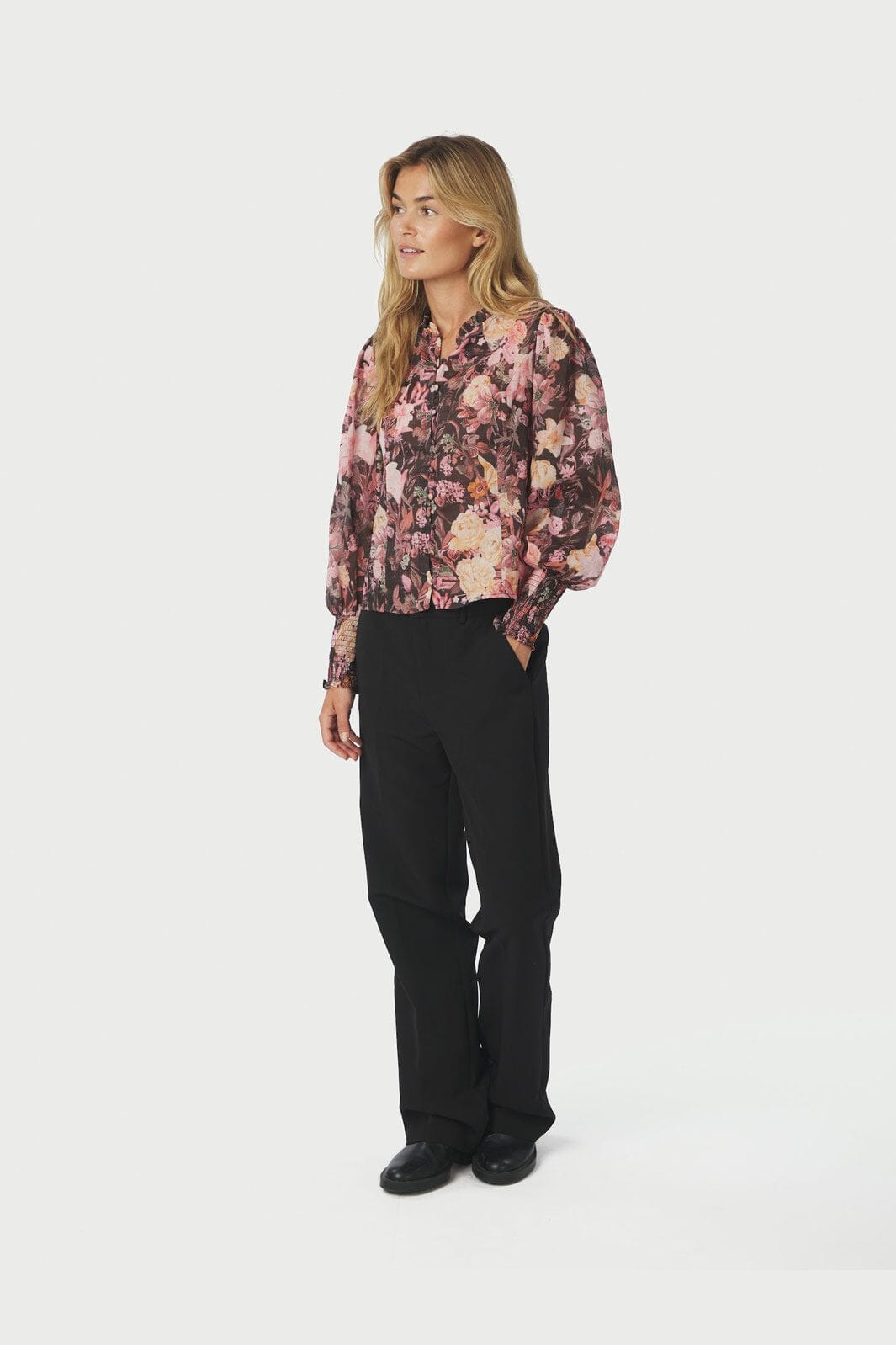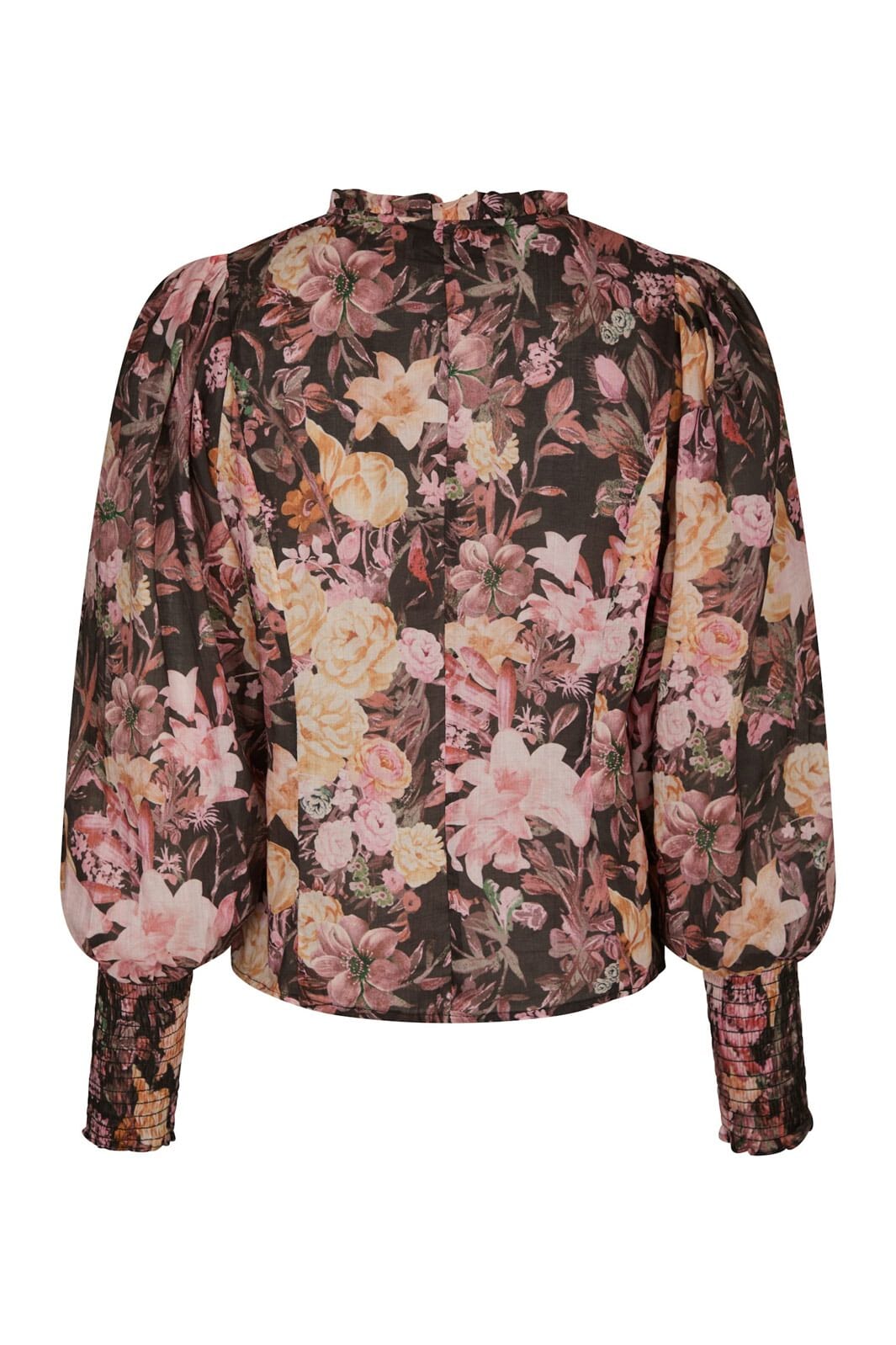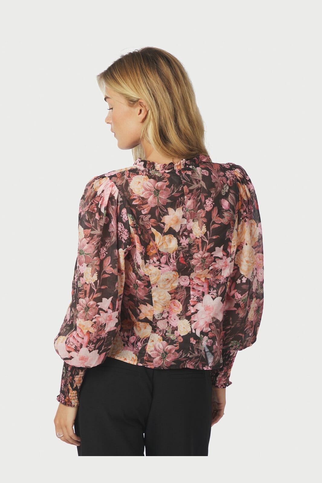 Blouse noire de Neo Noir avec motif floral en rose et crème. La blouse a un col haut avec des volants, des manches bouffantes et une fermeture à boutons à l'avant.