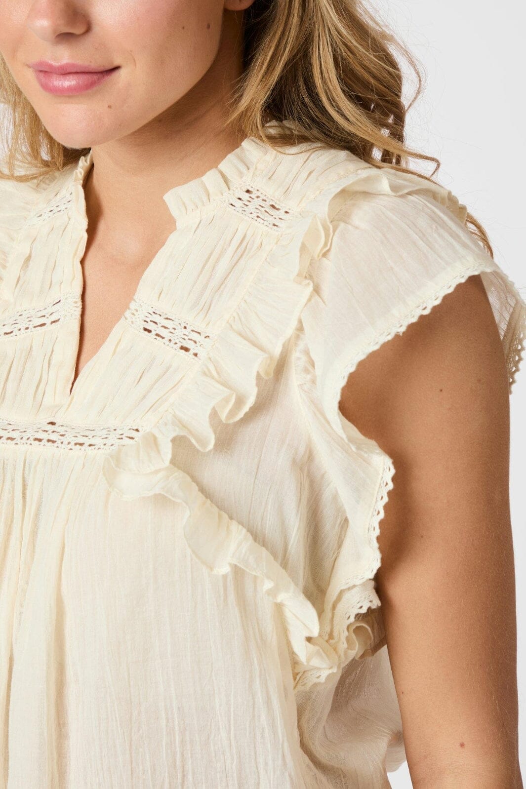 Top en voile jaune clair de Neo Noir avec volants et bandes cousues. Un modèle sans manches avec décolleté en V et coupe ample en tissu léger et aérien.