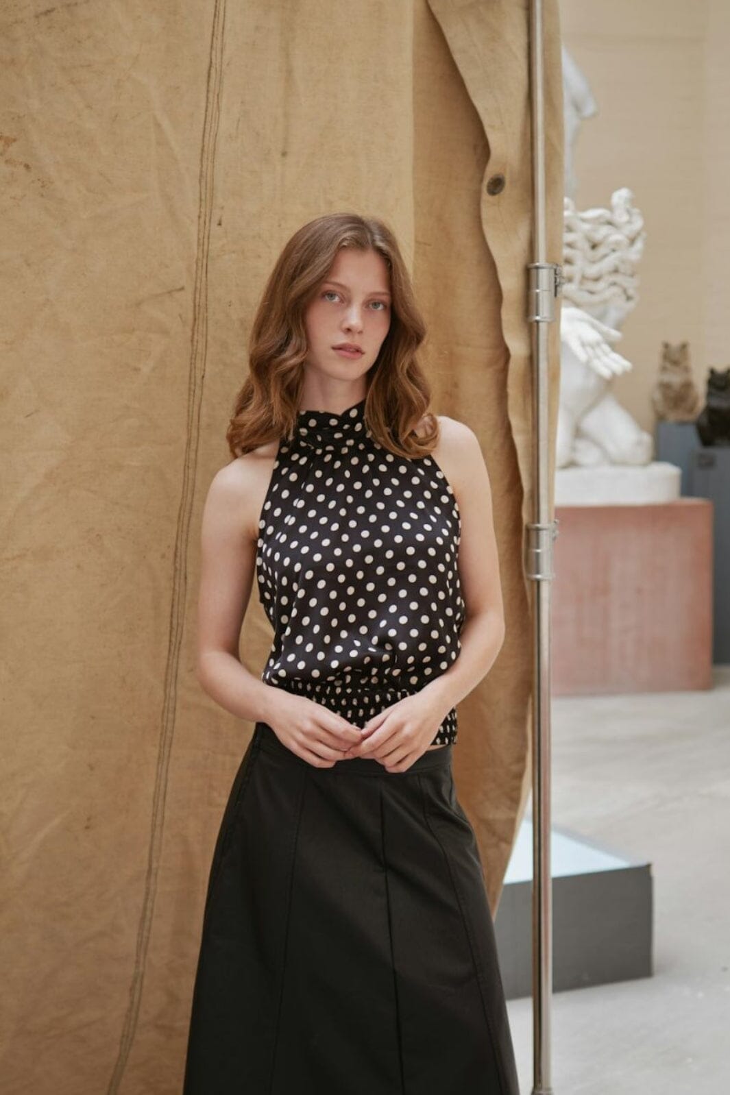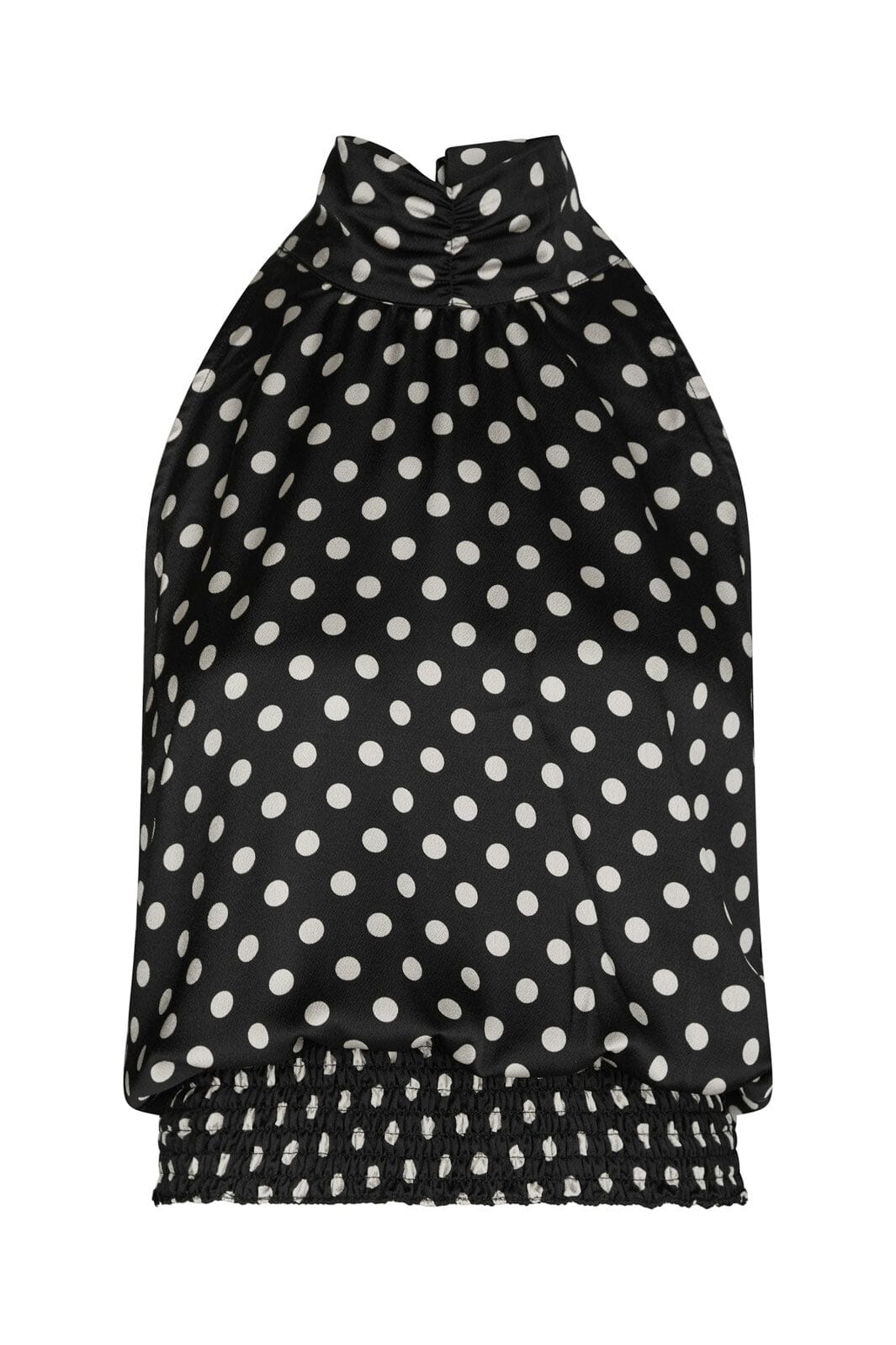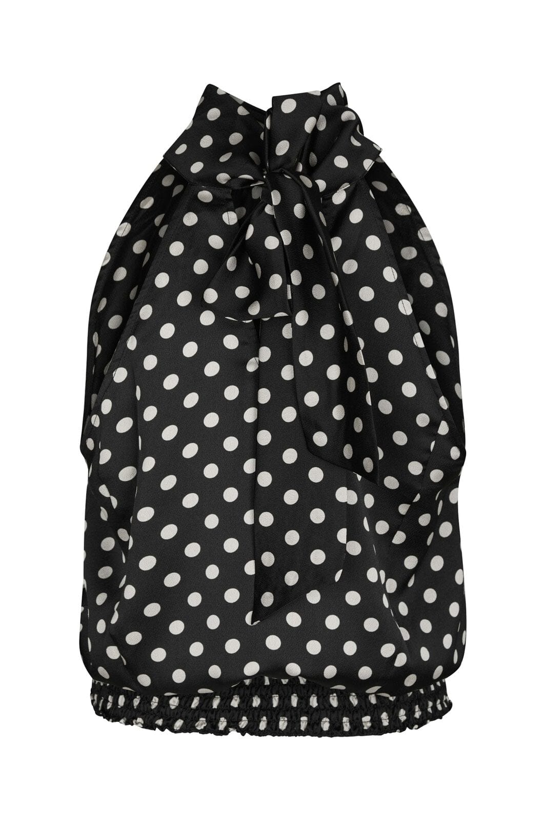 Top noir de Neo Noir avec des pois blancs. Le top a un col montant et un design halterneck avec un lien à nouer. Les détails smock en bas offrent un bon ajustement.
