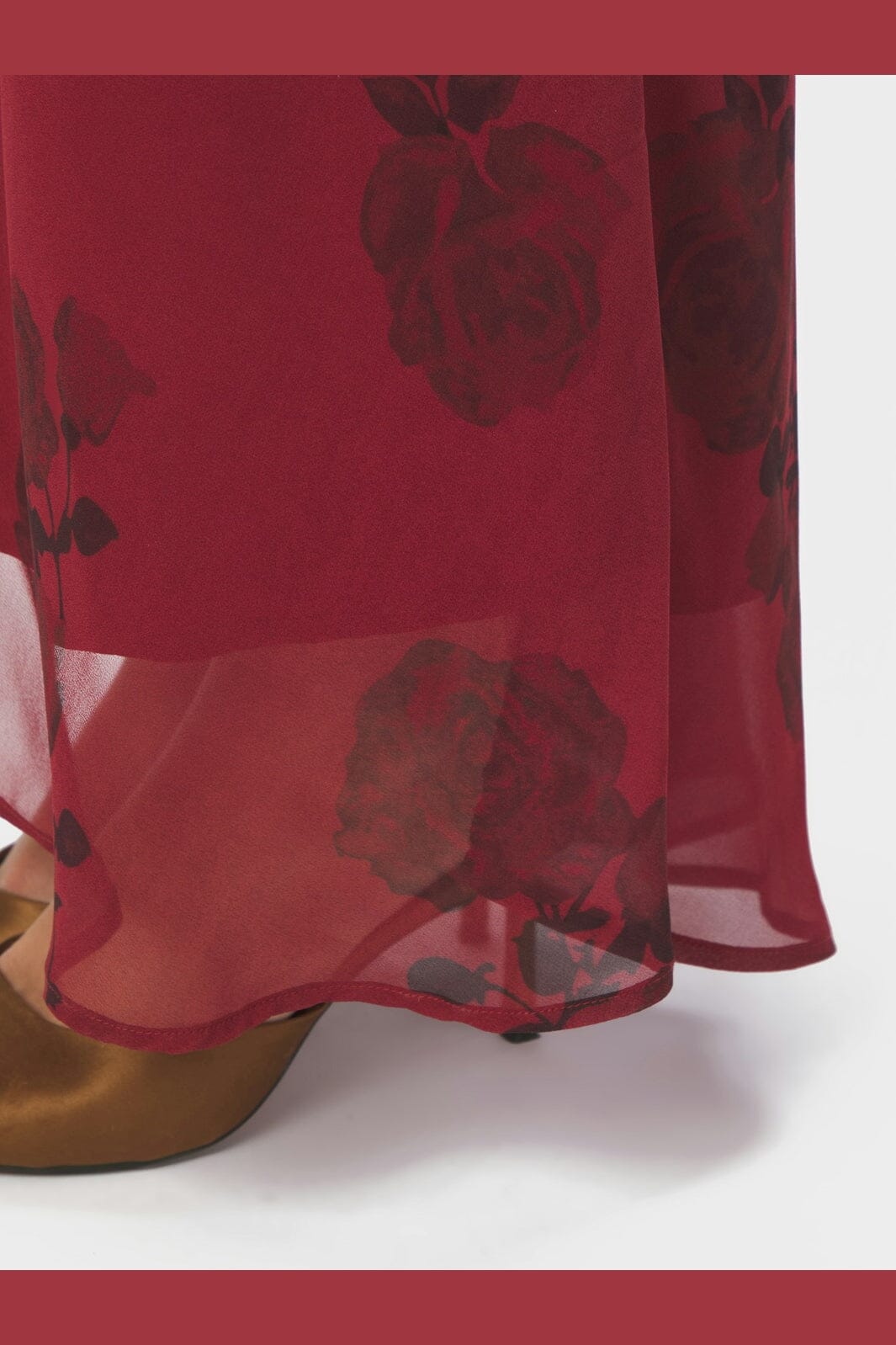 Robe maxi rouge foncé de Neo Noir en chiffon avec imprimé floral. La robe a un col rond, des détails volantés et un bord transparent en bas.