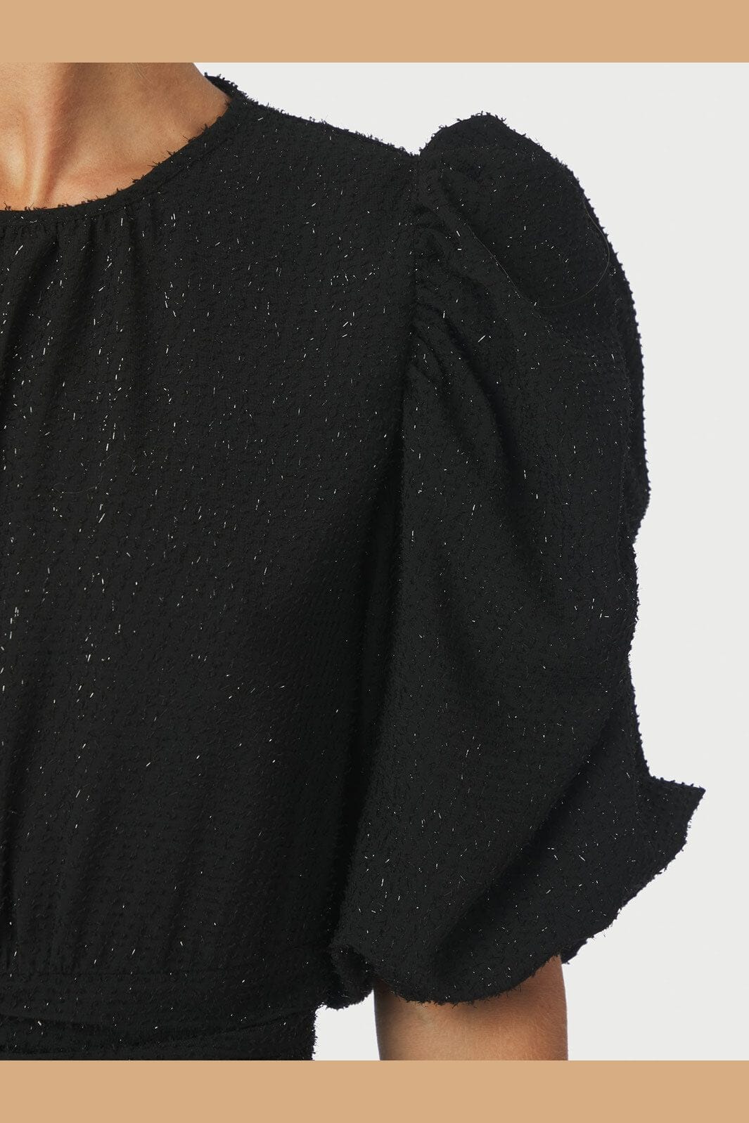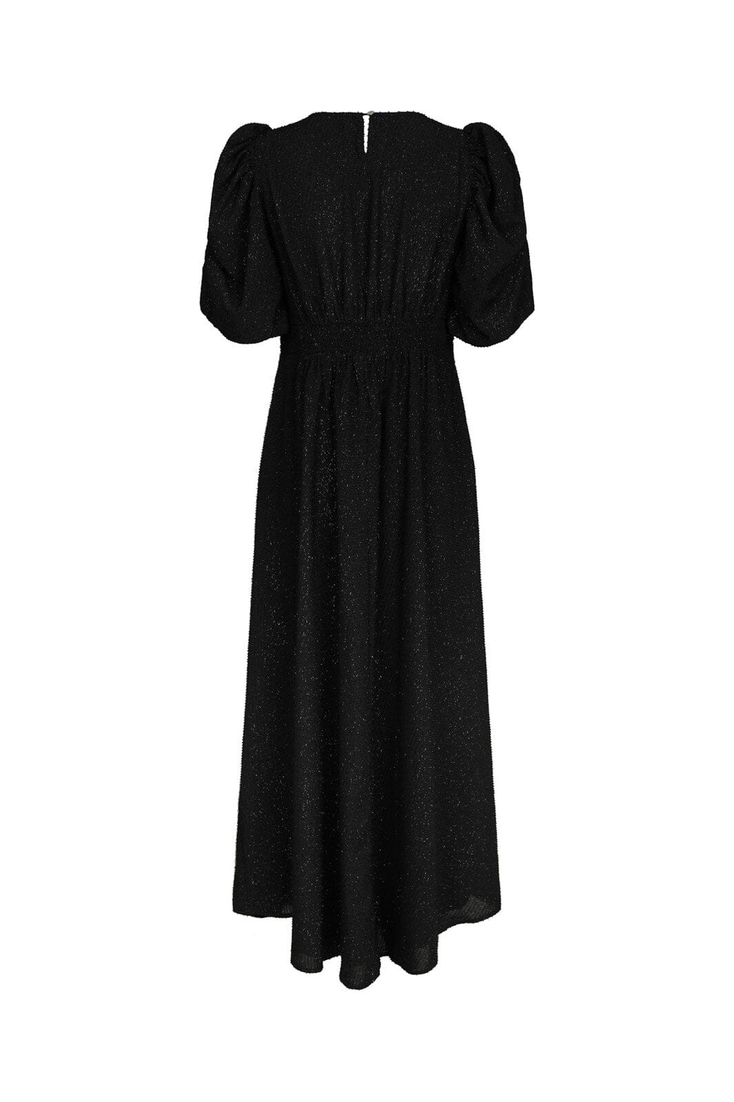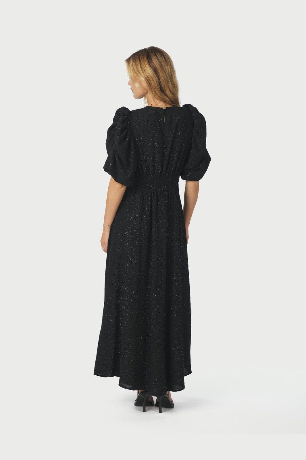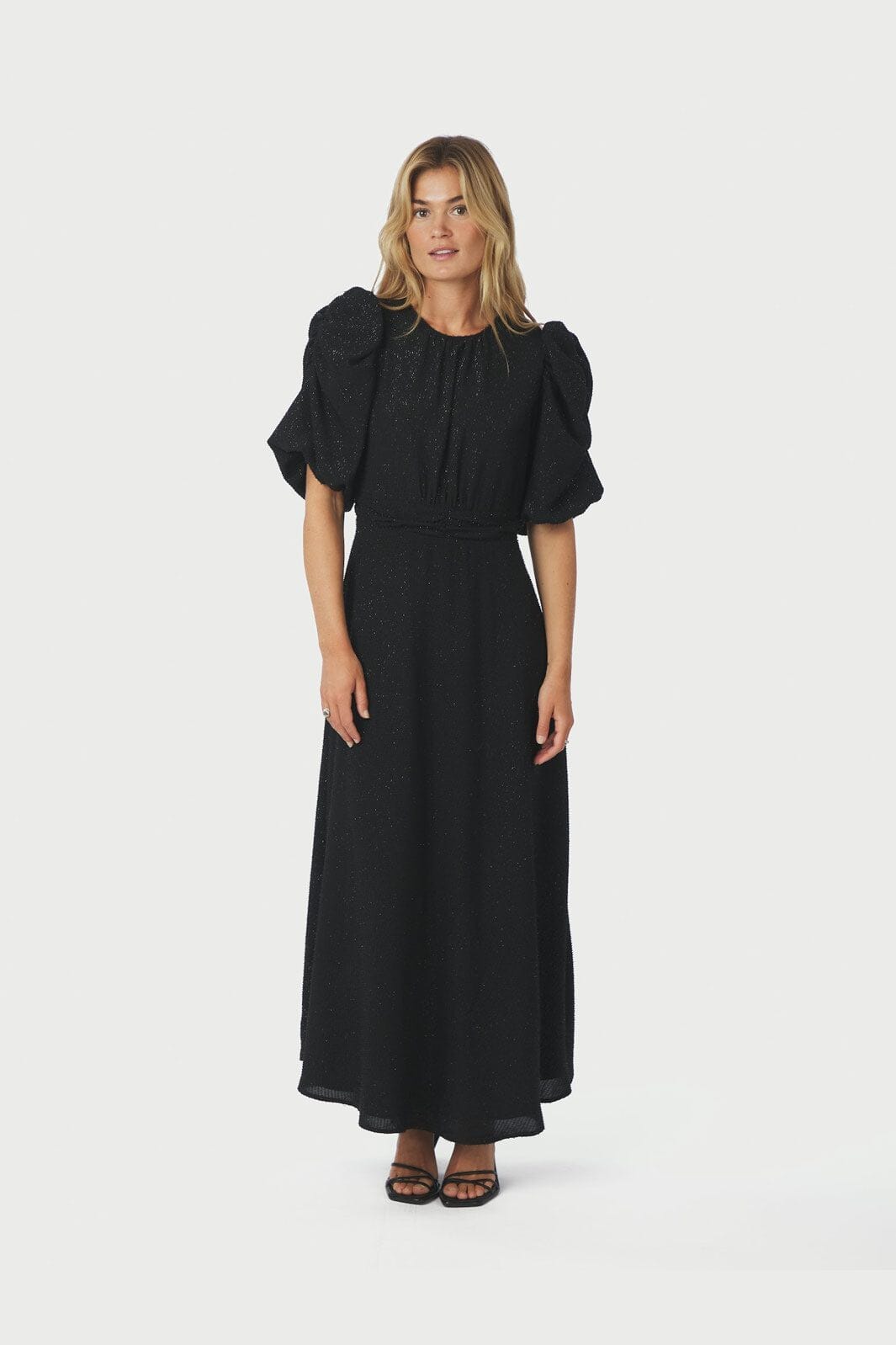 Robe longue noire de Neo Noir avec des détails scintillants et des manches bouffantes. La robe a un détail smocké à la taille à l'arrière et se ferme par des boutons dans le cou.