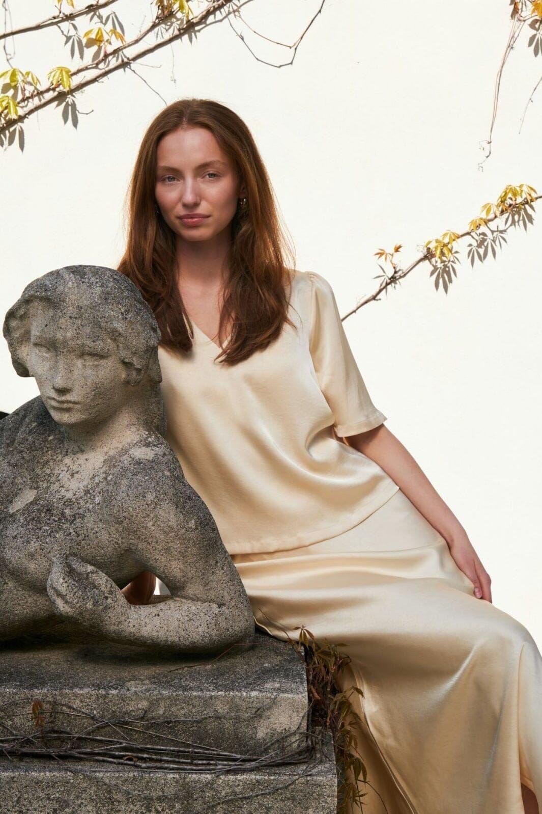 Blouse jaune clair de Neo Noir en satin. La blouse a des manches courtes, des épaulettes et un décolleté en V. Le tissu satiné donne un aspect brillant qui convient aussi bien au quotidien qu'aux fêtes.