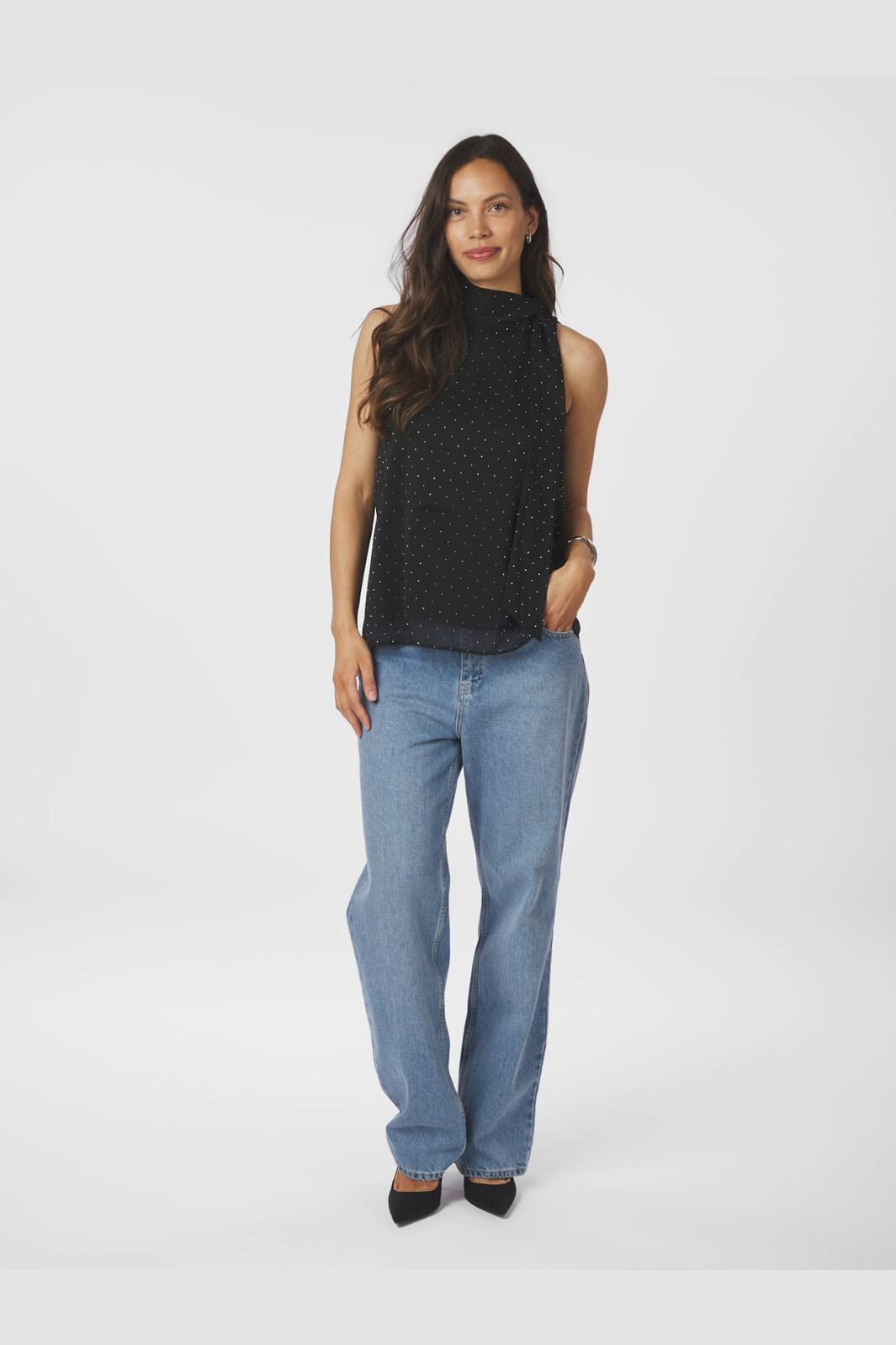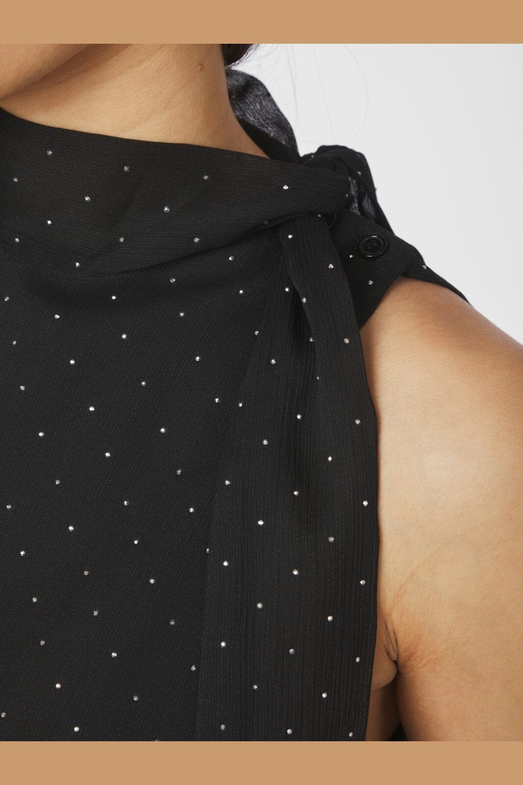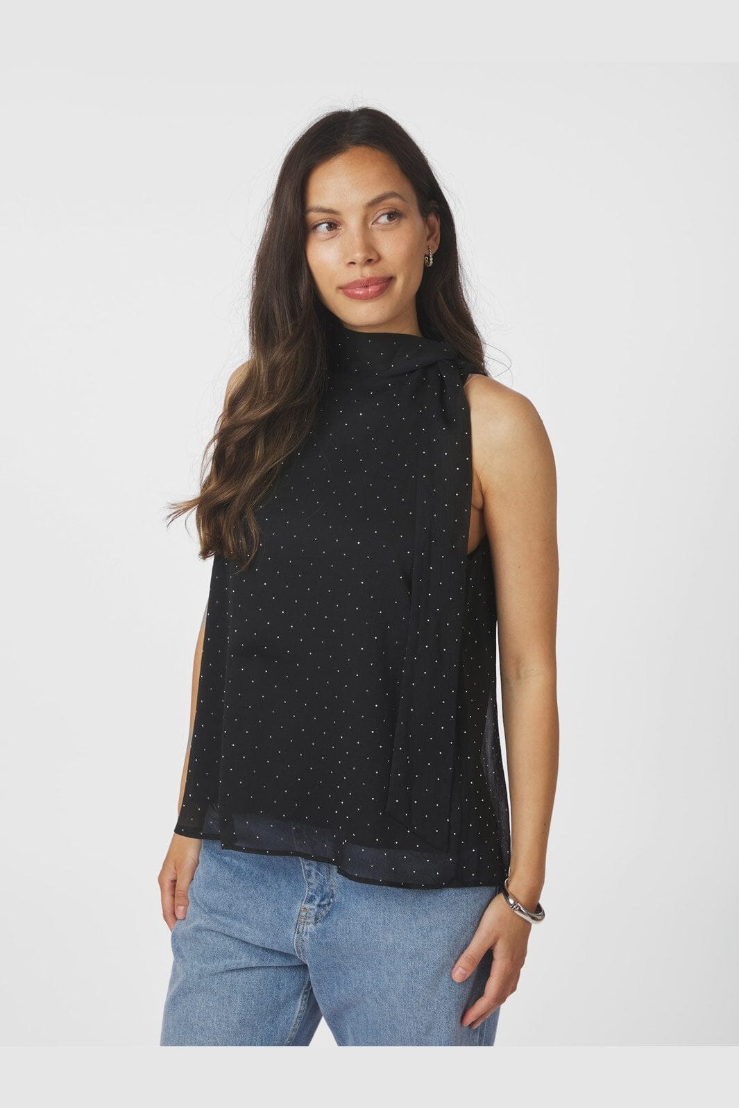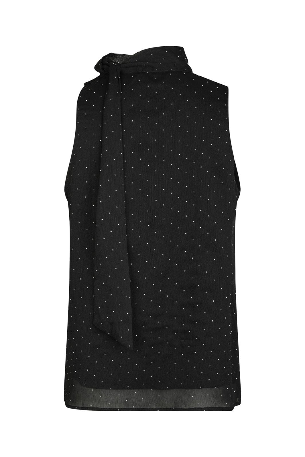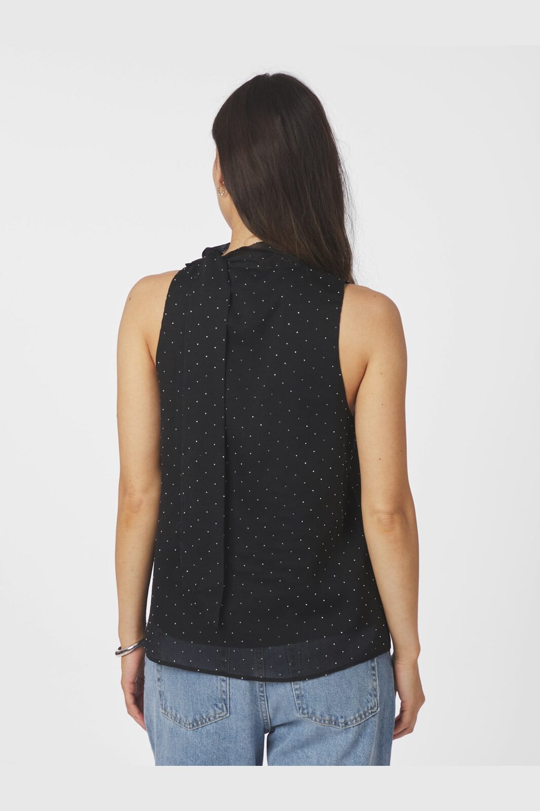 Top noir de Neo Noir avec des pois blancs et un col haut. Le top a une coupe ample et est fabriqué en chiffon avec des pierres cousues et un lien au niveau du cou.