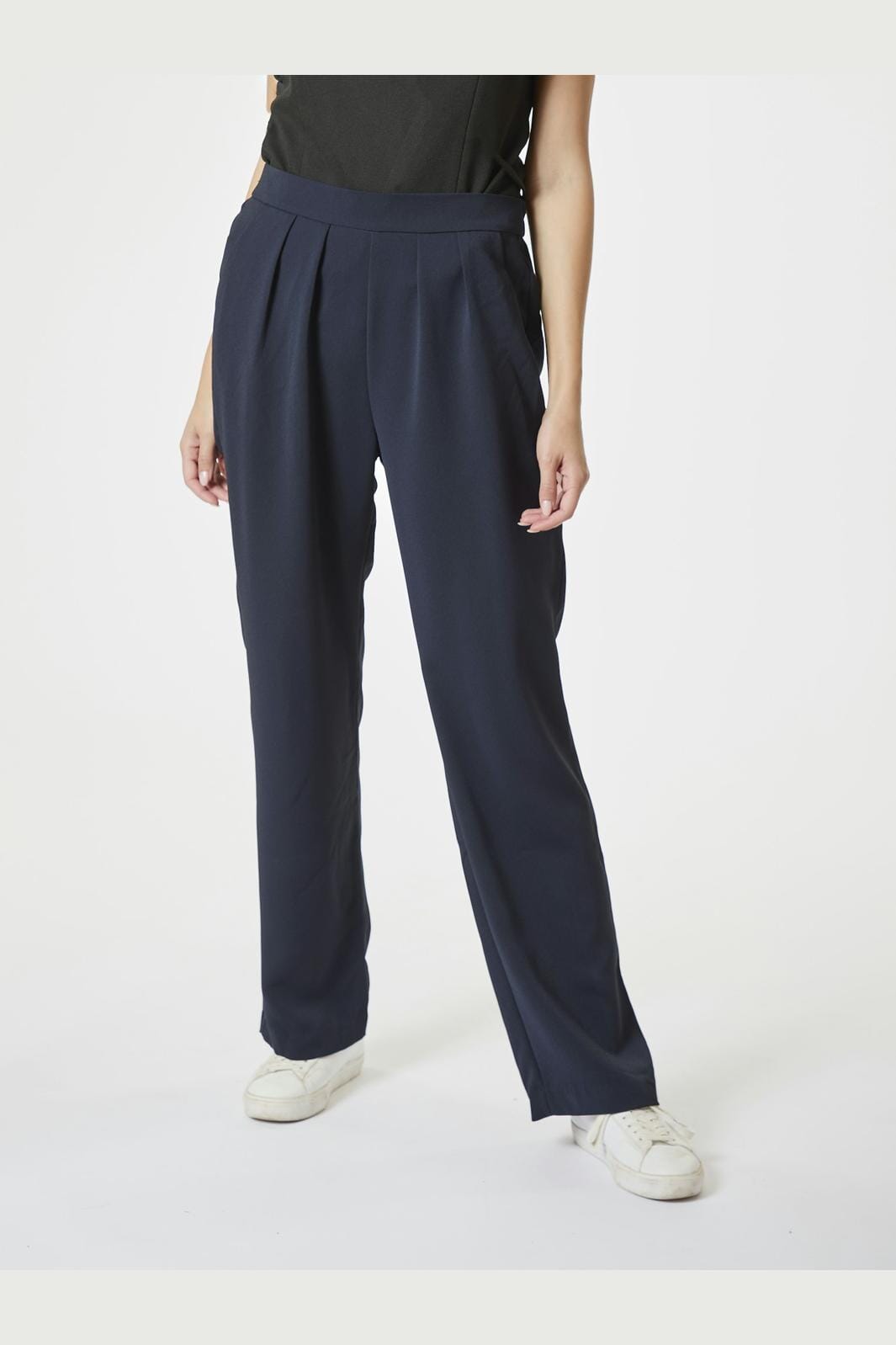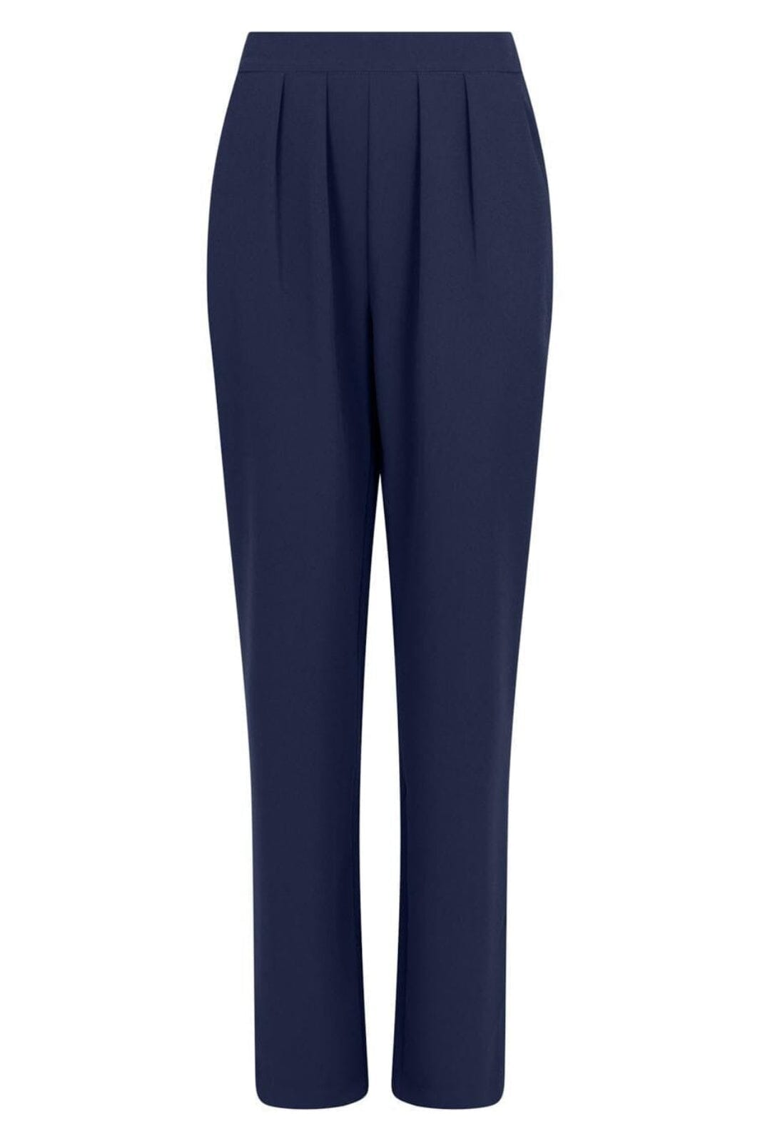 Pantalon bleu marine de Neo Noir en crepe avec plis à l'avant. Le pantalon a des jambes droites et un élastique à la taille ainsi qu'une longueur cheville.