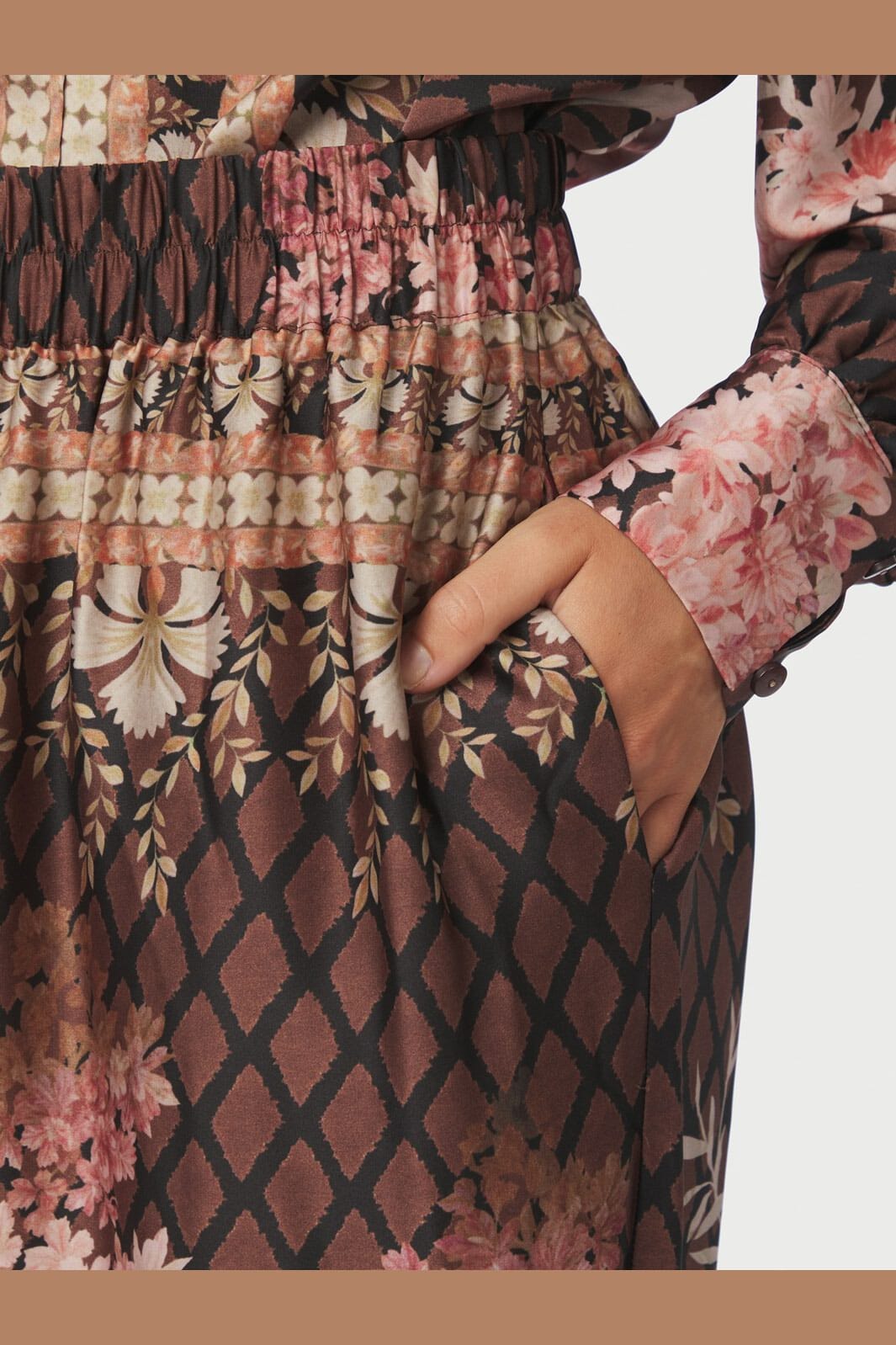 Pantalons noirs de Neo Noir avec un motif botanique. Les pantalons ont des jambes larges et une impression géométrique combinée avec des fleurs dans des nuances de rose sur un fond sombre.