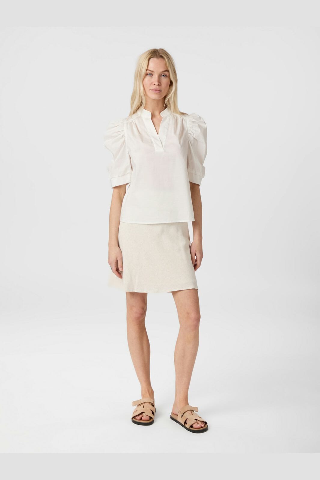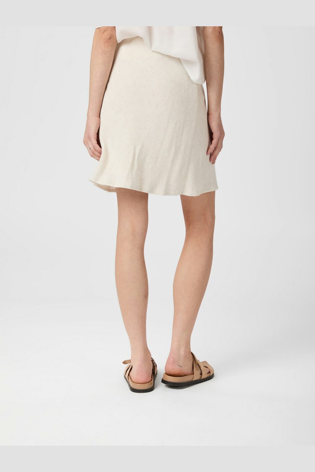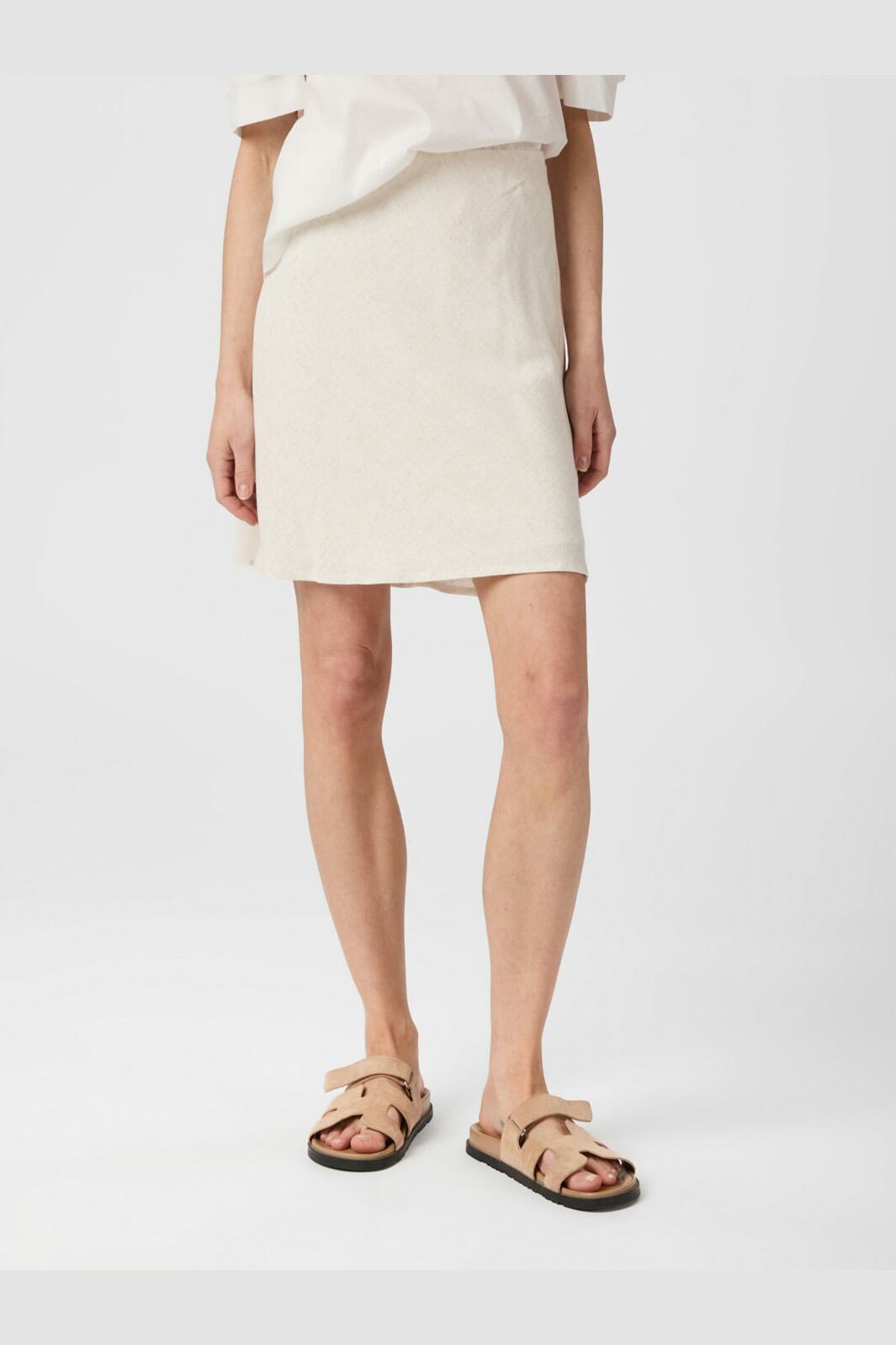 Jupe courte de Neo Noir en mélange de lin couleur naturelle. Coupe en A avec une coupe ample et un ourlet arrondi en bas.