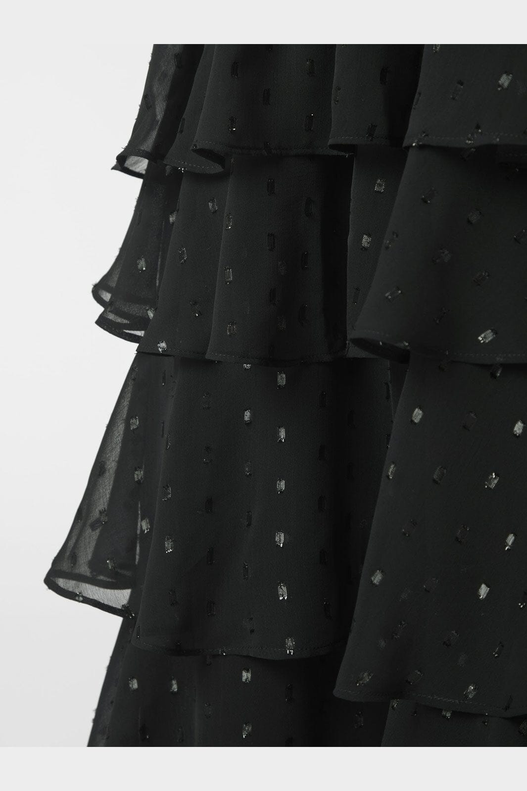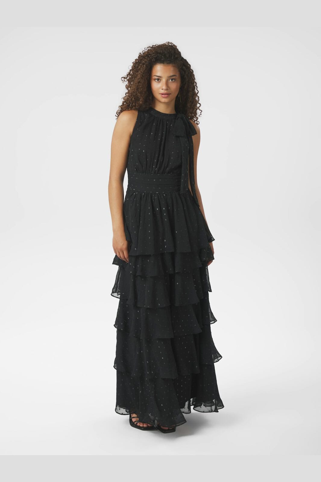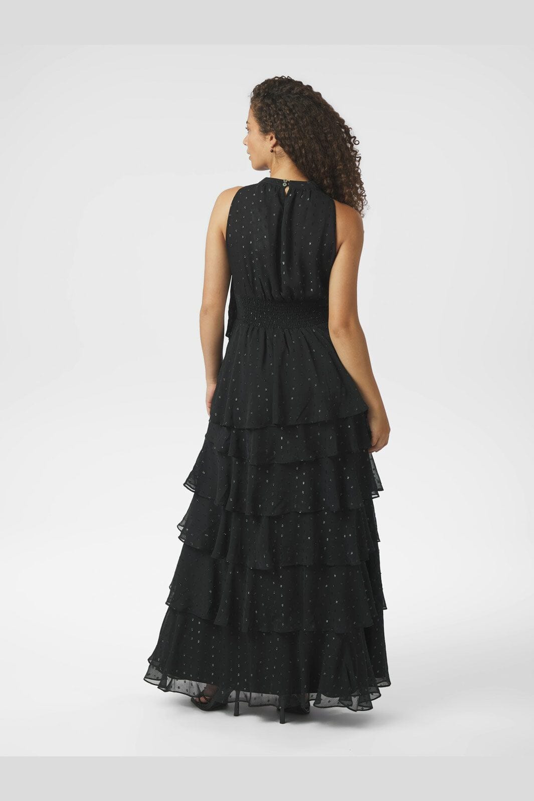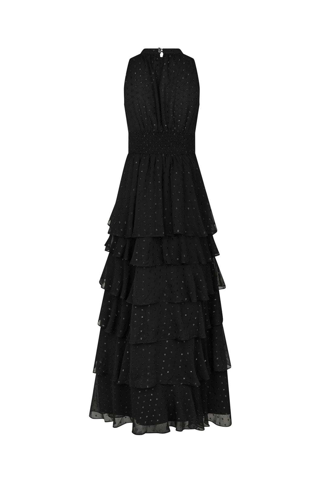 Robe longue noire de Neo Noir en qualité chiffon avec motif à pois. La robe a un col haut avec un nœud et est composée de plusieurs couches de tissu avec des volants.