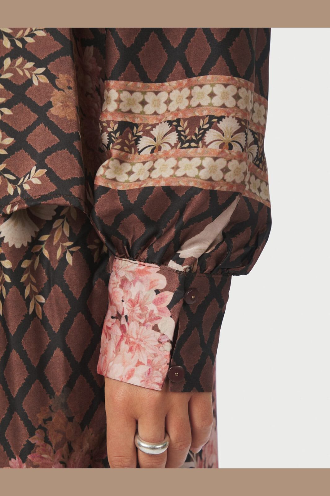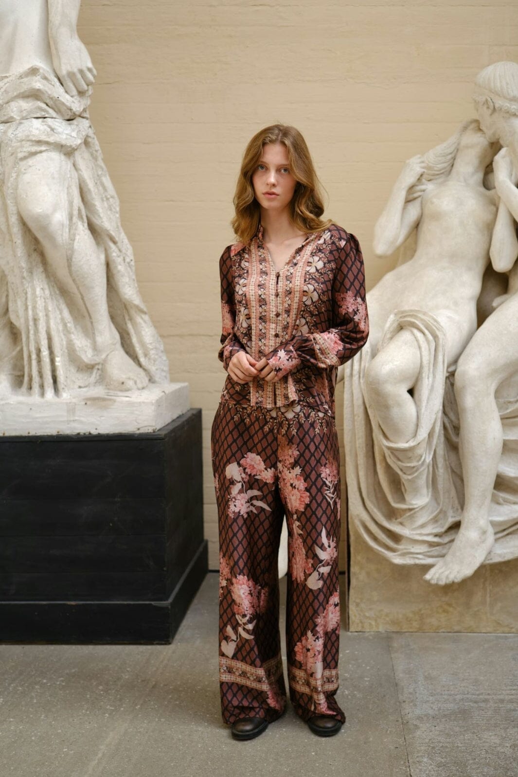 Blouse noire de Neo Noir avec imprimé floral en rose et couleurs terre. La blouse a un décolleté en V avec fermeture à boutons à l'avant et des manches longues avec des détails en volants.