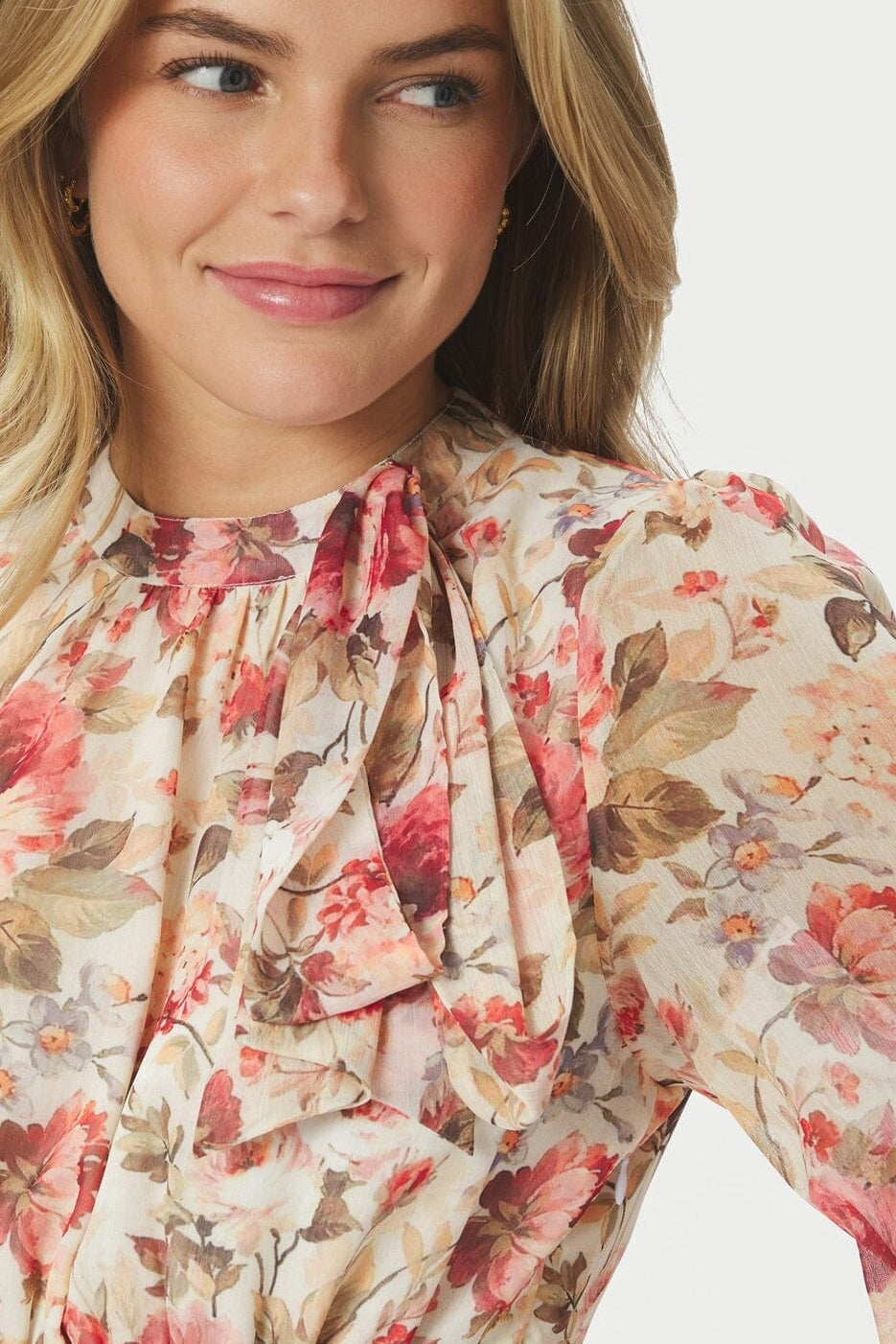 Robe Neo Noir à imprimé fleuri dans des tons crème et rouges. Elle présente un col montant avec lien à nouer, des manches longues et une coupe ample.