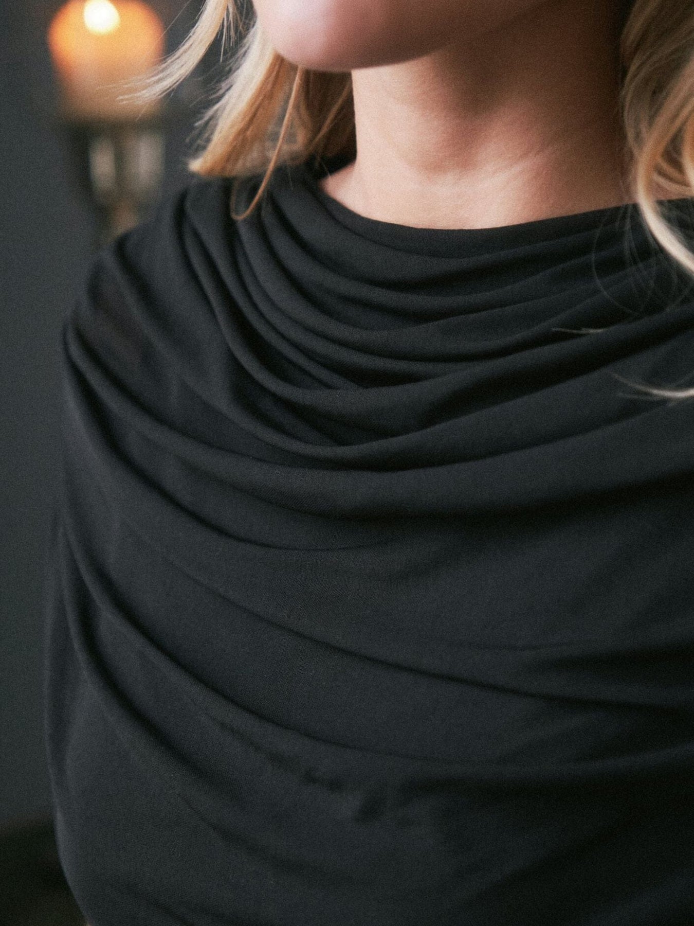Robe en mesh noire de Neo Noir avec un design drapé. La robe a des plis le long de la couture latérale et un effet cascade à l'avant qui crée du mouvement dans le tissu.