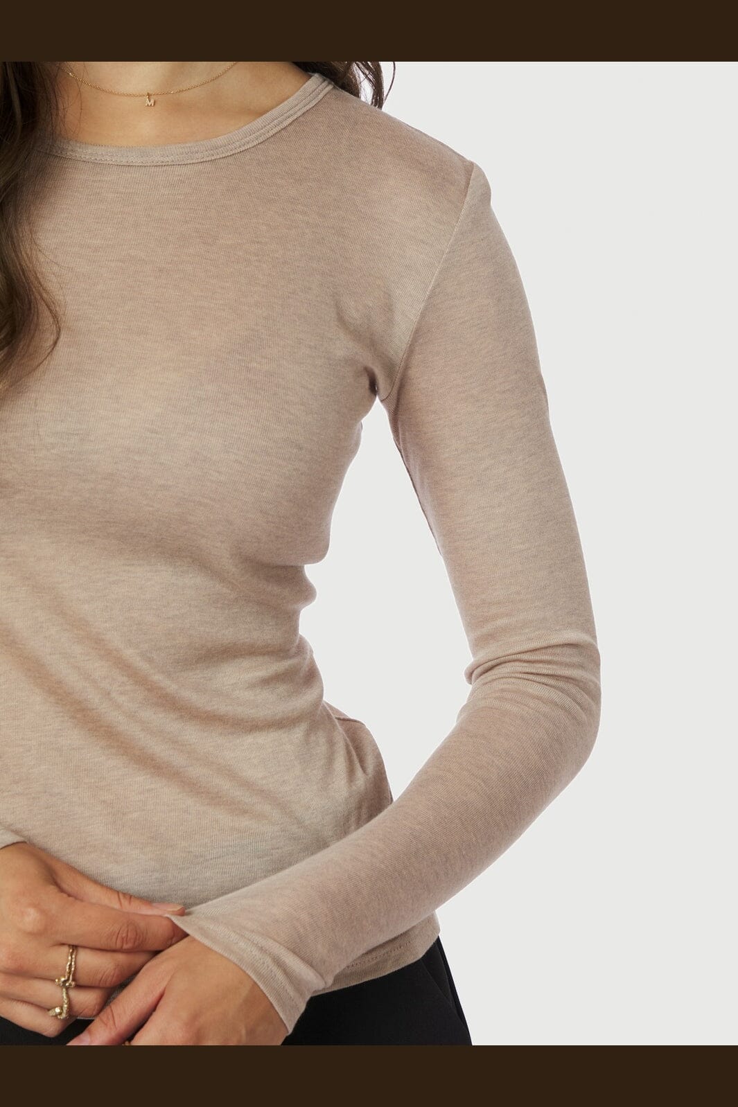 Blouse beige mélangé de Neo Noir en matière côtelée. Une blouse près du corps avec un col rond et des manches longues dans une couleur neutre qui s'accorde avec de nombreuses autres couleurs.