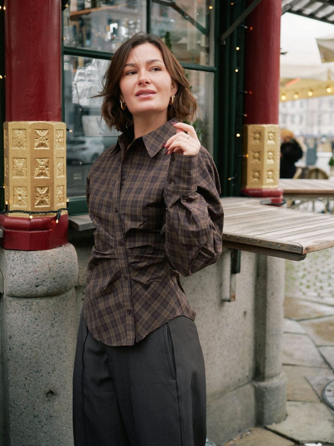 Chemise à carreaux marron foncé de Neo Noir avec fermeture à boutons asymétrique. La chemise a un col classique et des détails froncés qui lui donnent une expression unique.