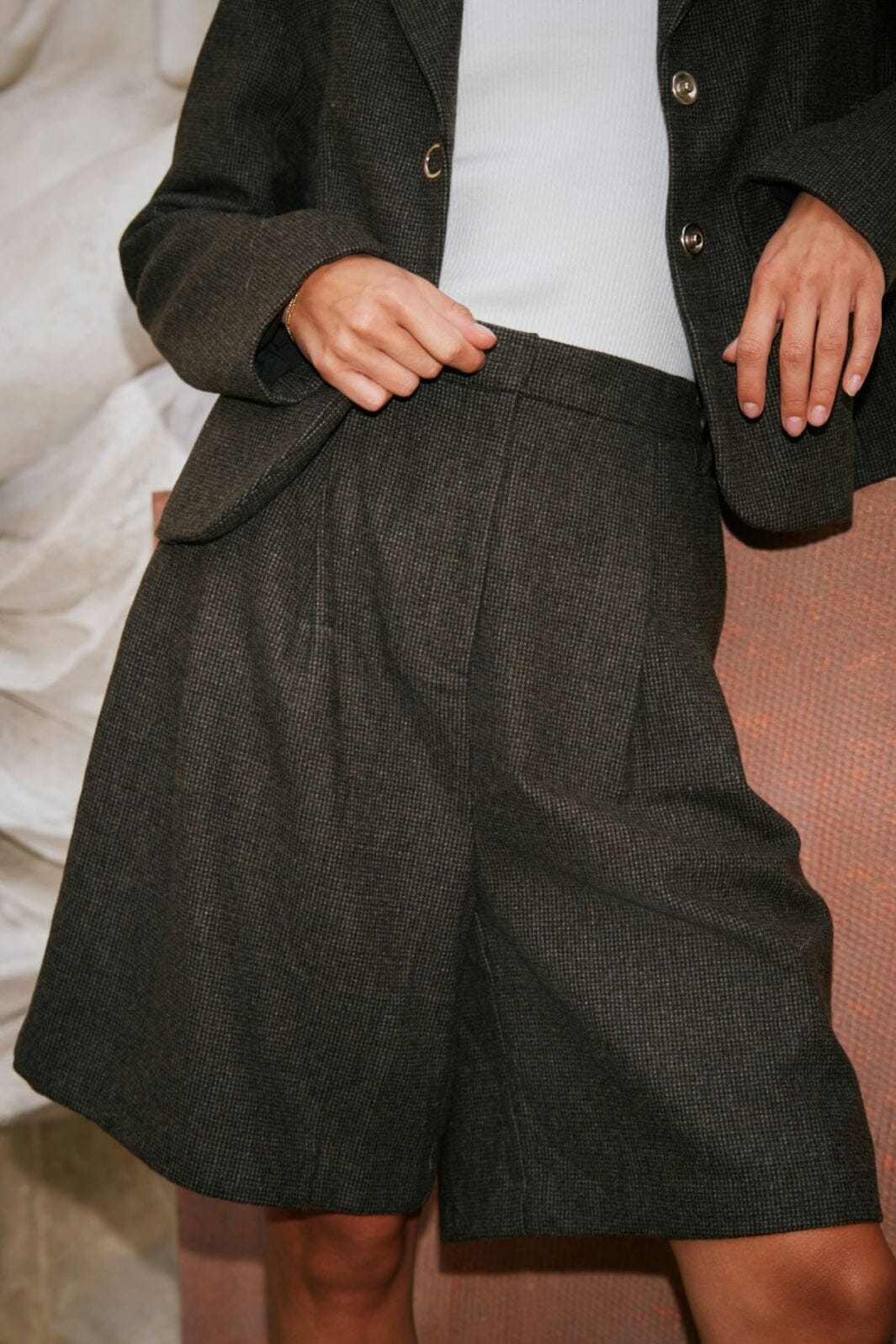 Shorts à carreaux bruns de Neo Noir avec taille haute et larges plis. Les shorts ont une coupe ample et une longueur genou, ce qui les rend faciles à styliser pour différentes occasions.