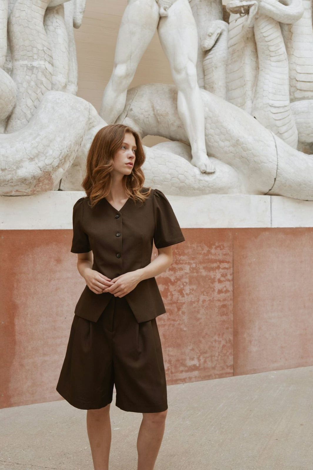 Shorts marron foncé de Neo Noir avec des jambes larges et des plis à l'avant. Les shorts ont une taille haute et une coupe ample qui offre une bonne liberté de mouvement.