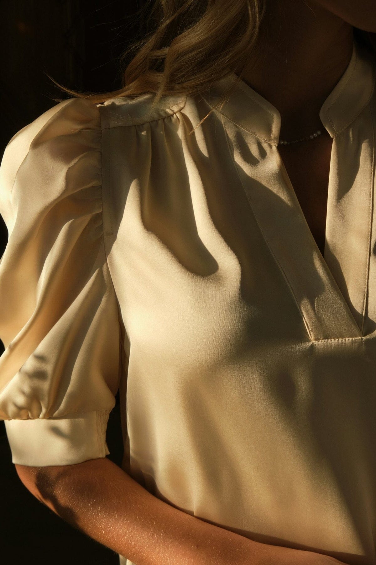 Blouse Neo Noir jaune clair en satin mat. La blouse convient aussi bien aux occasions formelles qu’au quotidien et aux événements festifs.