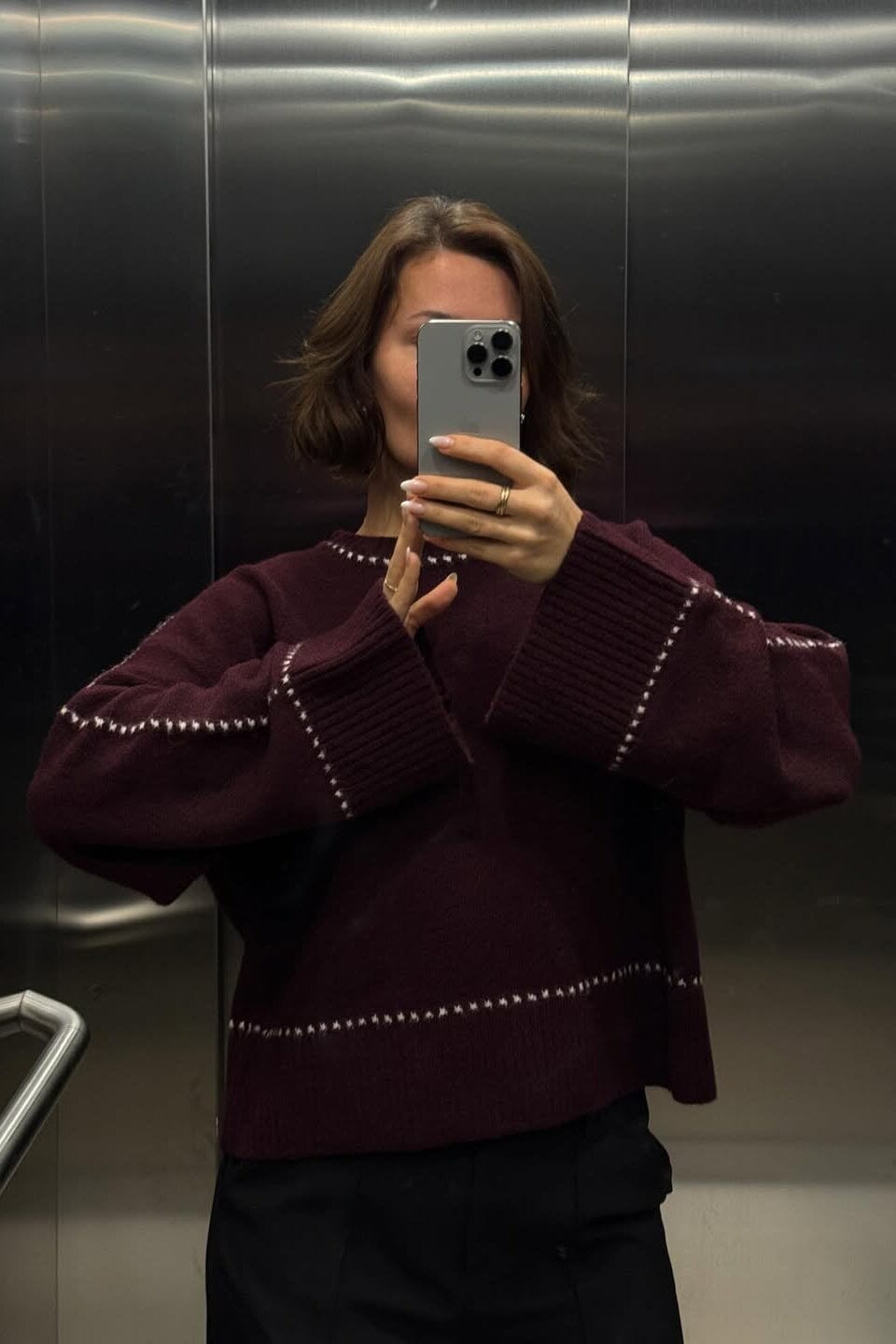 Pull en maille bordeaux de Neo Noir avec col rond et coutures visibles. Le pull a une coupe ample et des manches longues avec des coutures décoratives.
