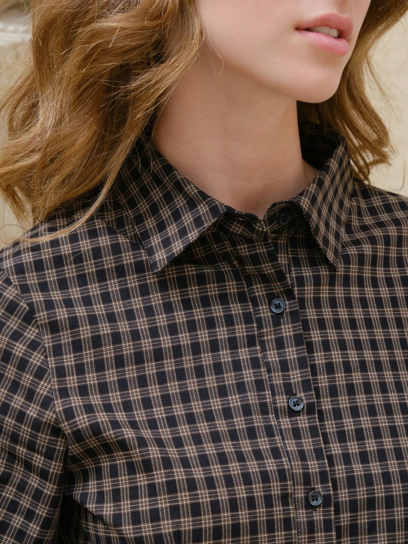 Chemise à carreaux de Neo Noir en noir et brun. La chemise a une coupe slim fit et des manches longues avec de larges poignets.