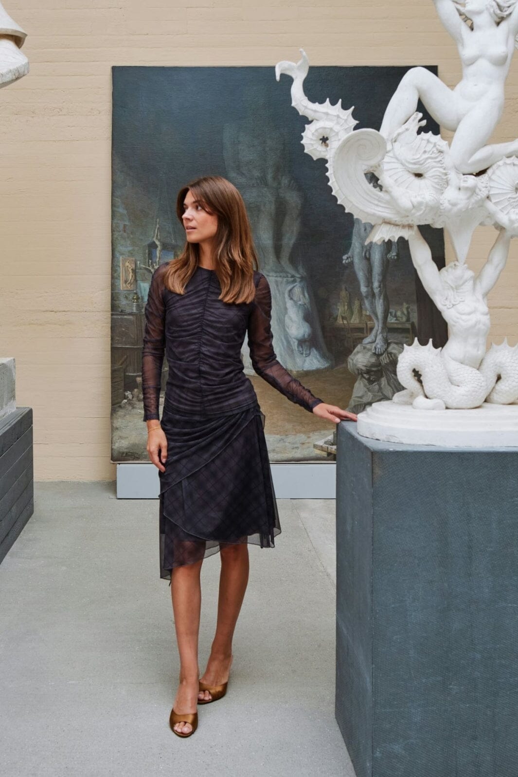 Jupe en mesh gris foncé de Neo Noir avec motif à carreaux. La jupe asymétrique a un design drapé avec des volants et des ruffles qui lui donnent une chute douce.
