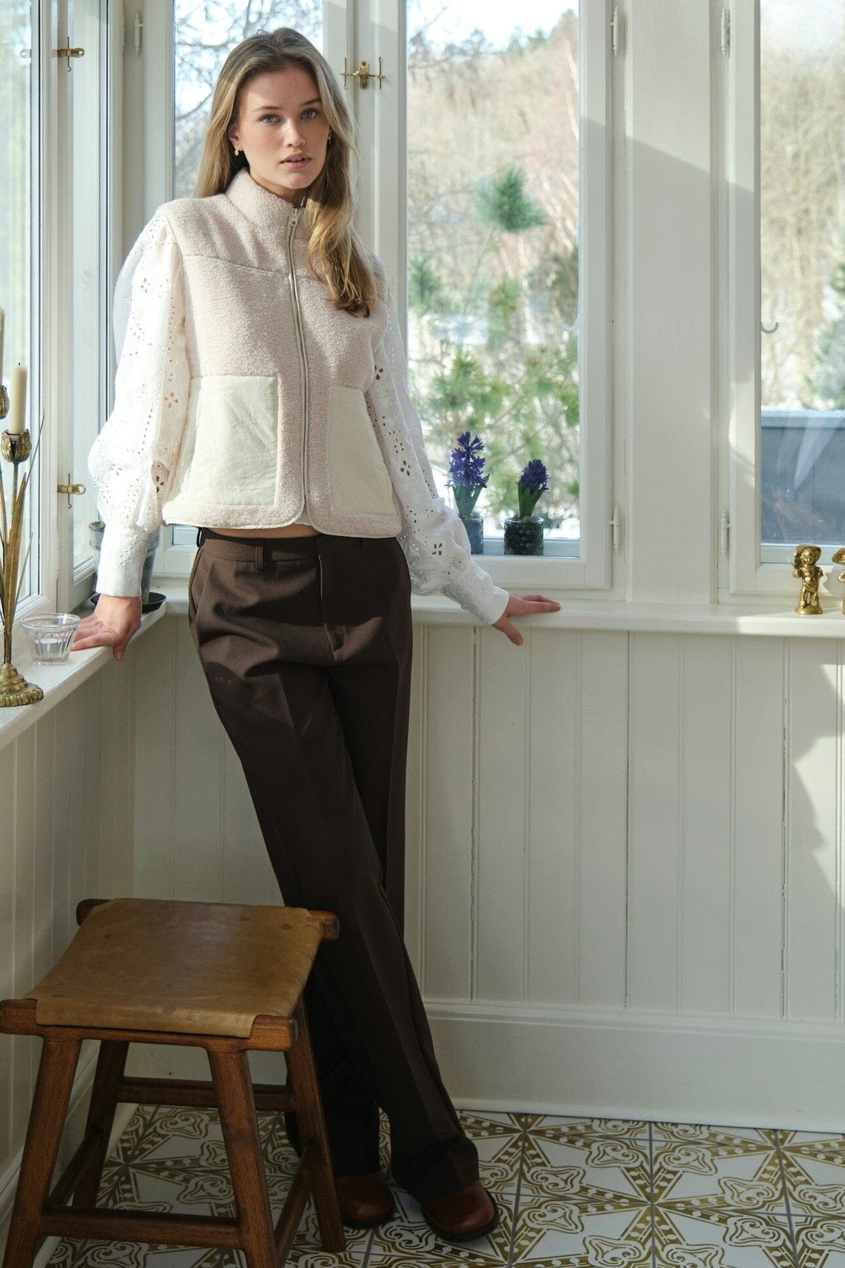 Gilet sans manches de Neo Noir en matière teddy douce et de couleur ivoire claire. Le gilet convient aux environnements décontractés et chaleureux à la maison, avec deux grandes poches sur le devant.