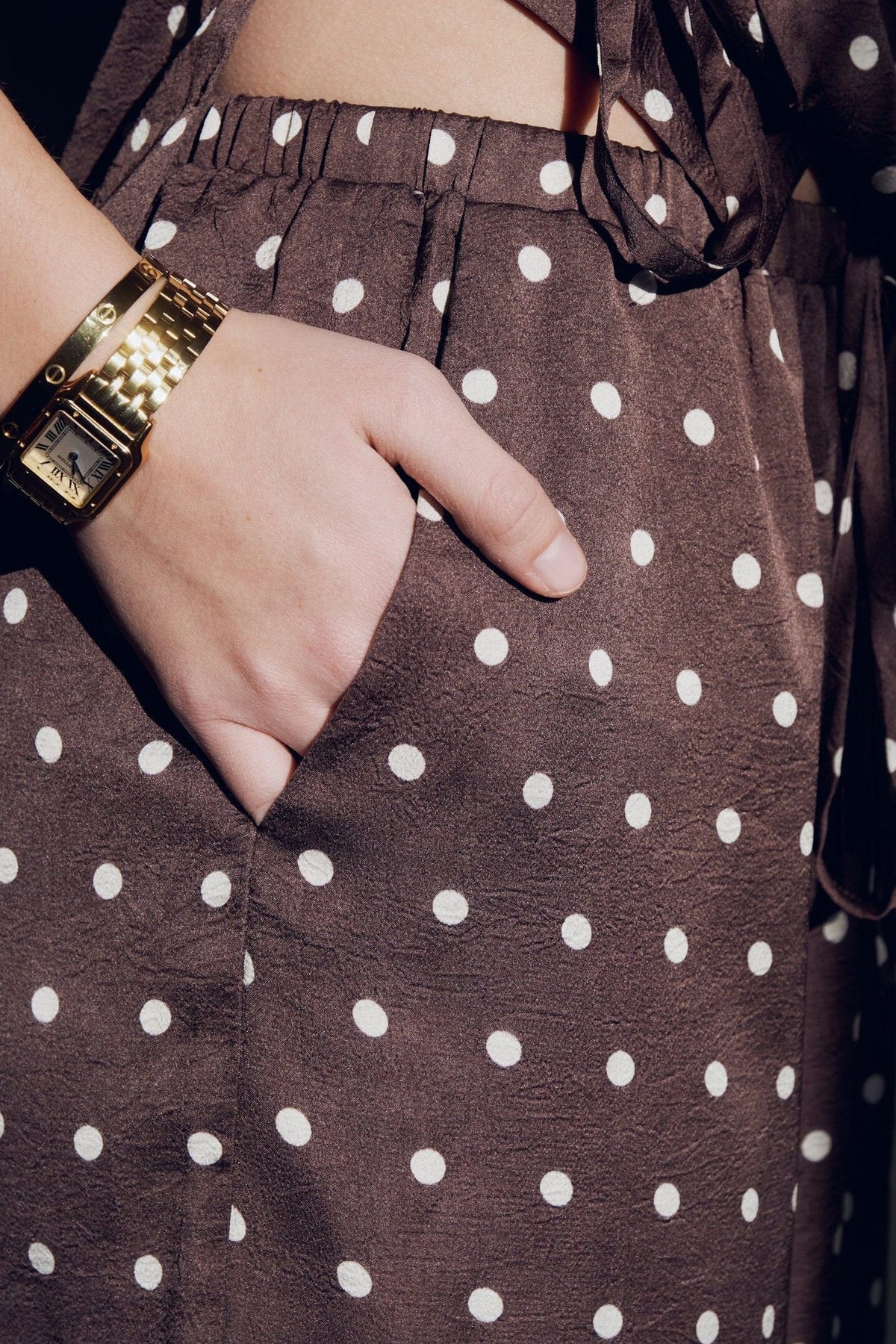 Pantalon marron foncé Neo Noir à pois blancs. Confectionné en 100 % polyester avec une coupe ample et une longueur jusqu’au sol.