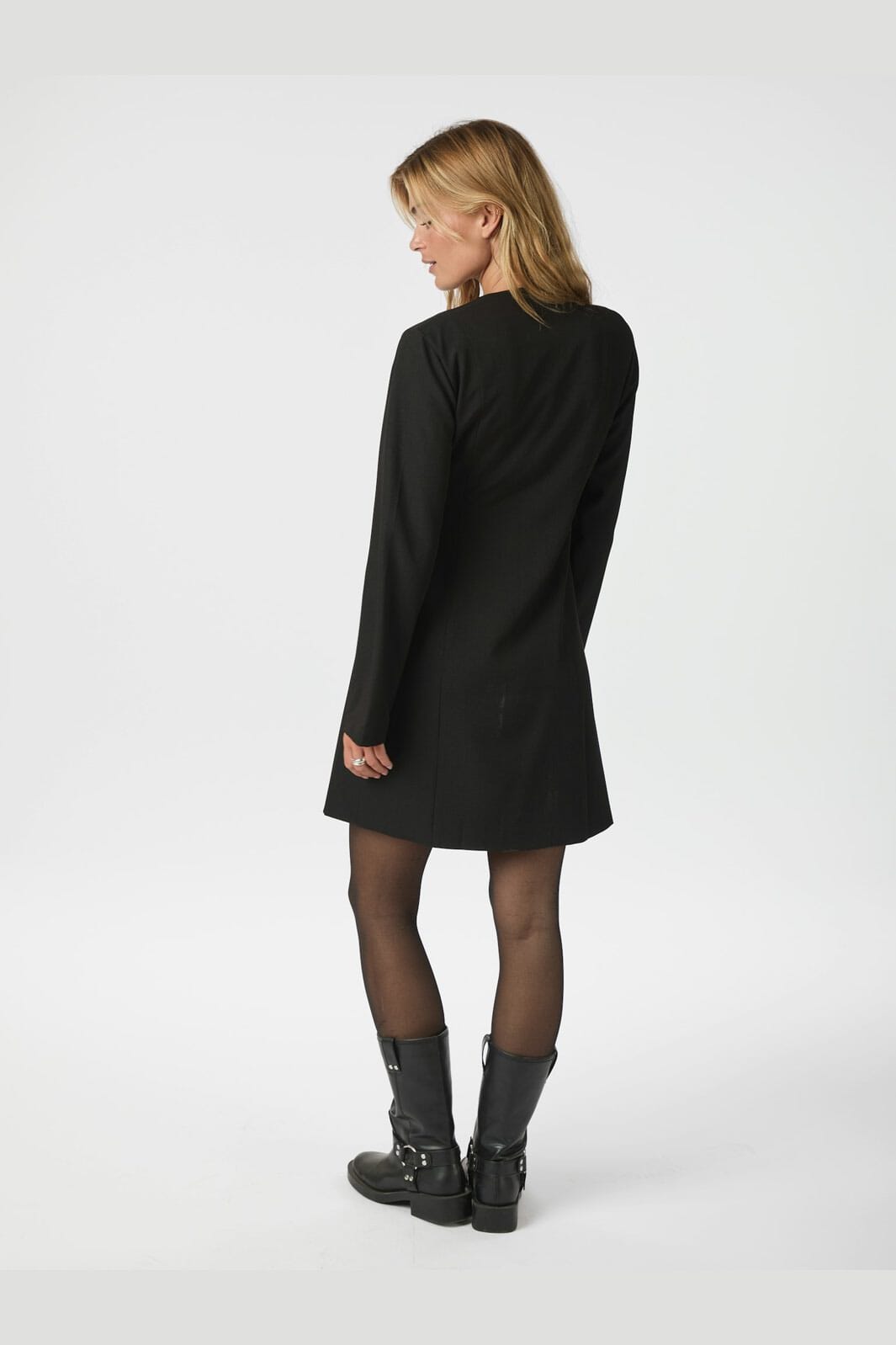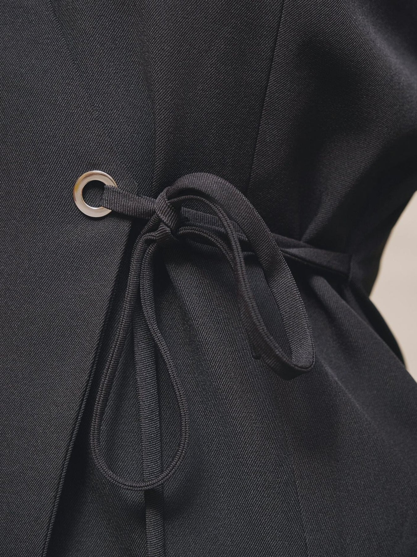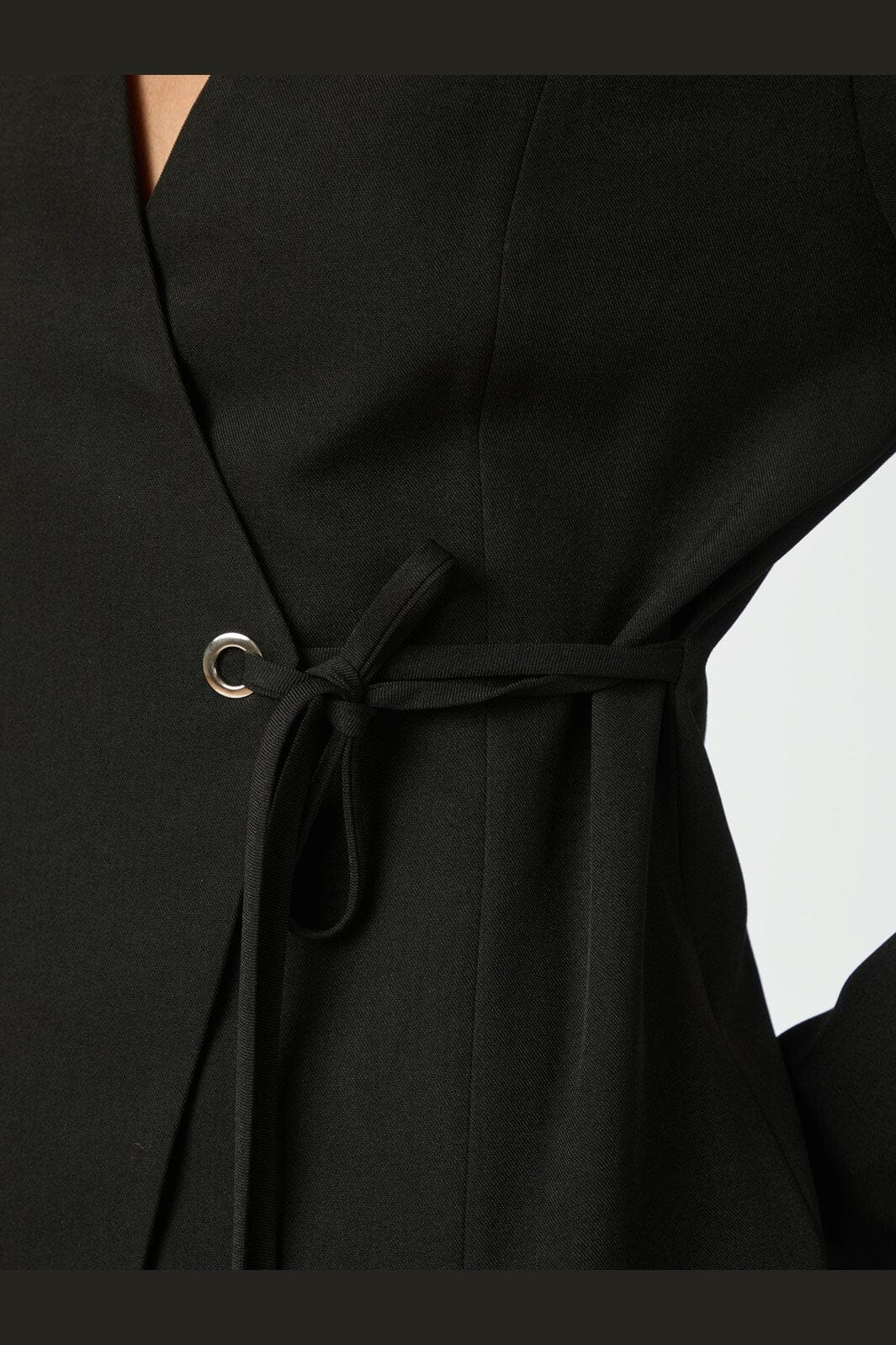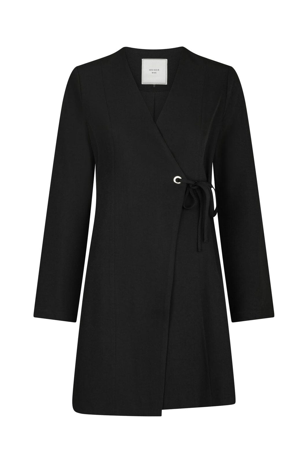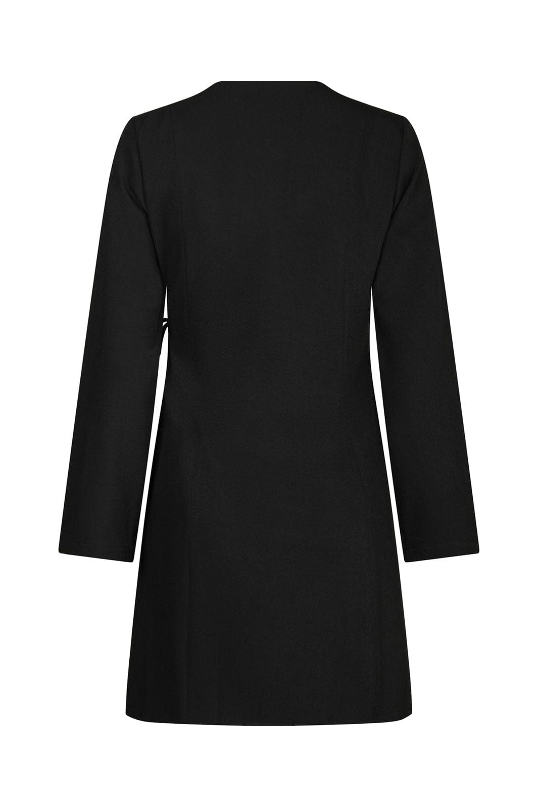 Robe portefeuille noire de Neo Noir avec décolleté en V et manches 3/4. La robe présente des détails de lacets avec un anneau en métal sur le côté, permettant d'ajuster la coupe.