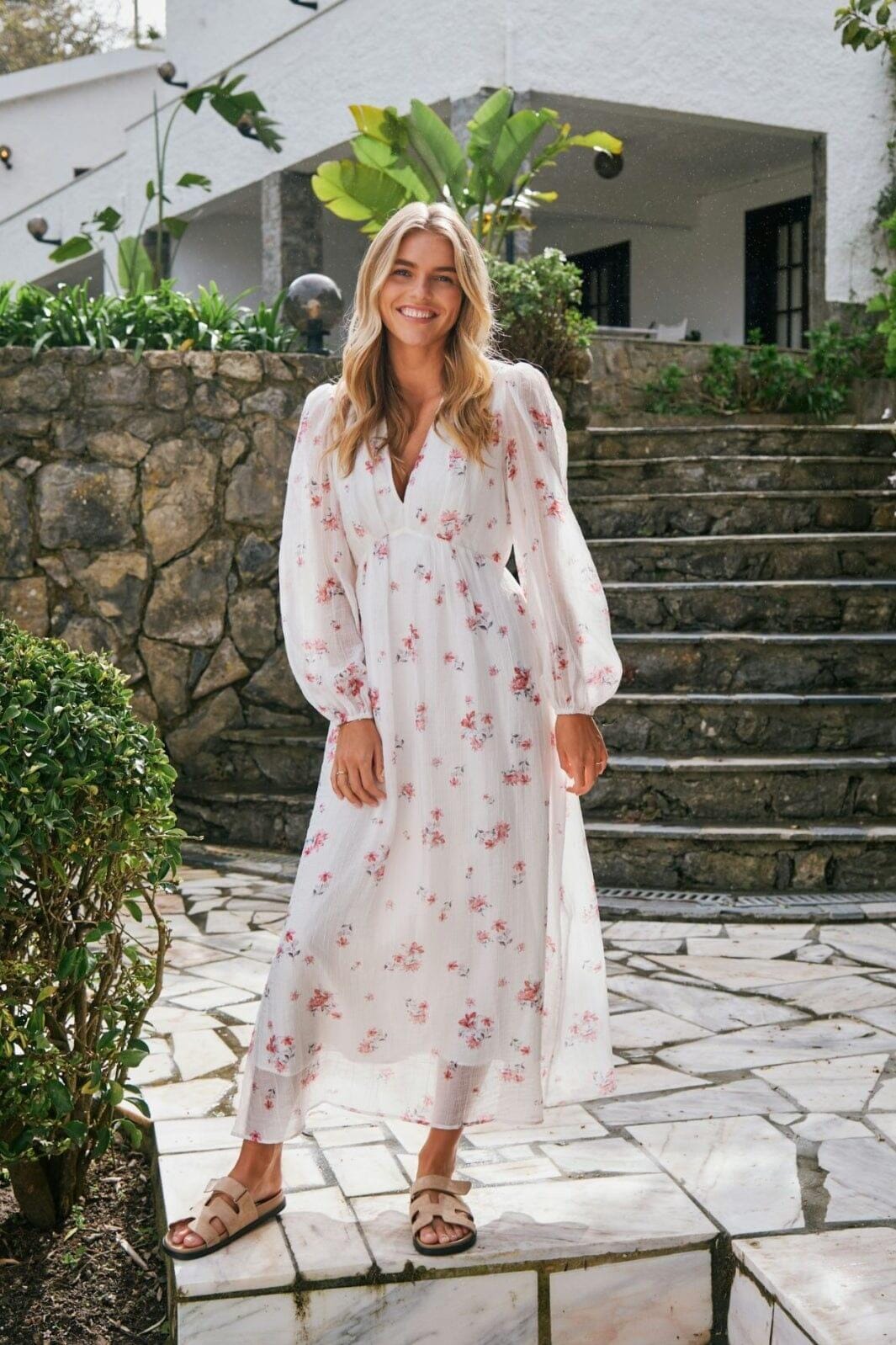 Robe longue à la cheville de Neo Noir en blanc avec imprimé floral rose et gris. La robe a des manches bouffantes, un décolleté en V et une coupe semi-loose qui offre une bonne liberté de mouvement.