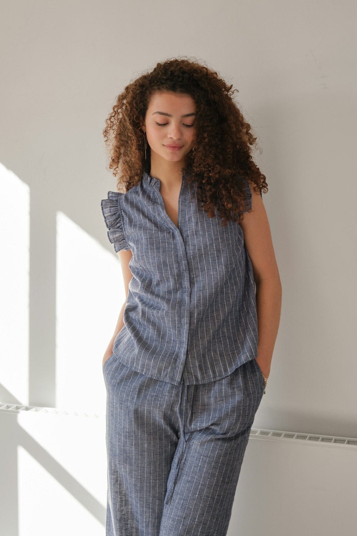 Haut bleu de Neo Noir avec des rayures verticales blanches. Le haut est fabriqué en 100 % coton et possède des manches froncées.