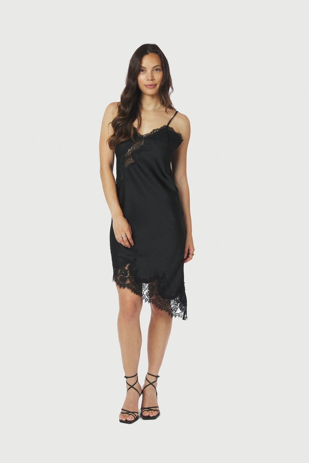 Robe en dentelle noire de Neo Noir avec bord asymétrique. La robe a des bretelles fines et des détails en dentelle au niveau du décolleté en V ainsi qu'au long du bas.