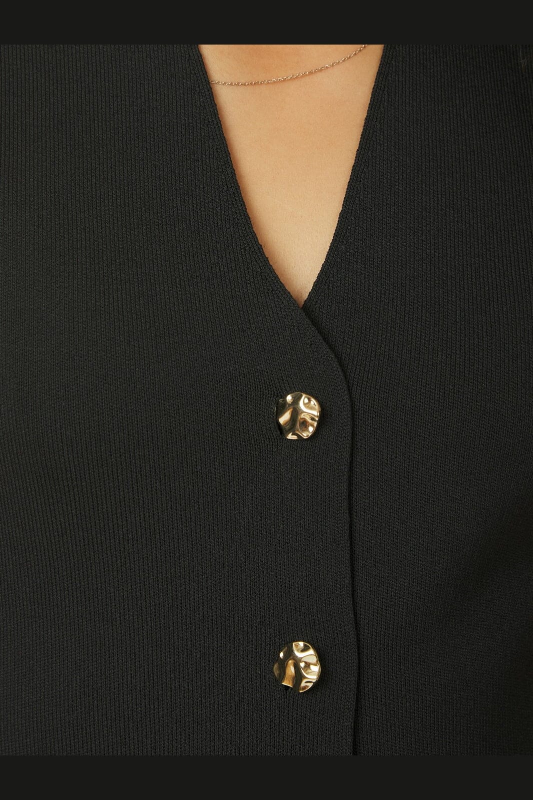Gilet en tricot noir de Neo Noir avec décolleté en V et boutons dorés. Le gilet a une coupe slim fit et une ouverture fendue pratique à l'avant qui facilite l'ajustement.