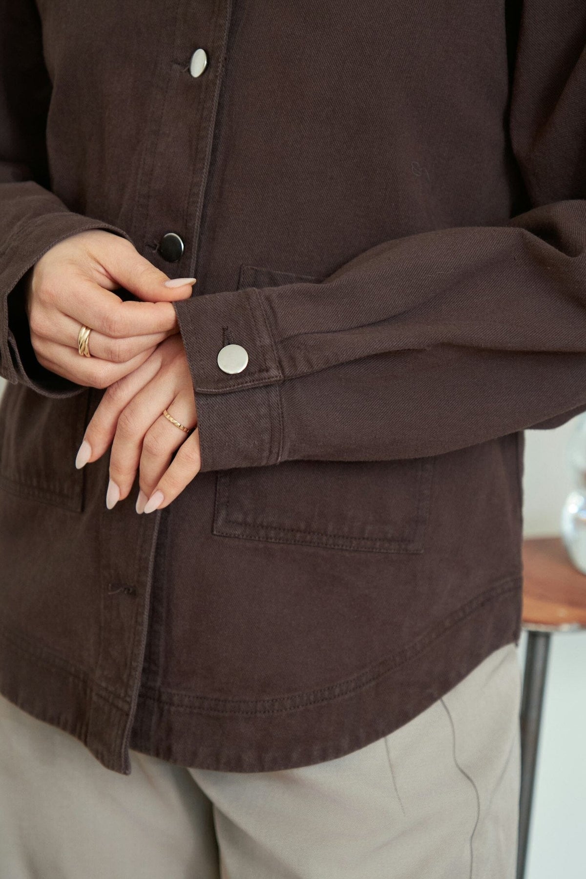 Veste marron foncé de Neo Noir en toile. La veste a une coupe décontractée avec des boutons à l'avant et deux poches poitrine à rabat. Les coutures décoratives donnent à la veste une touche rustique.