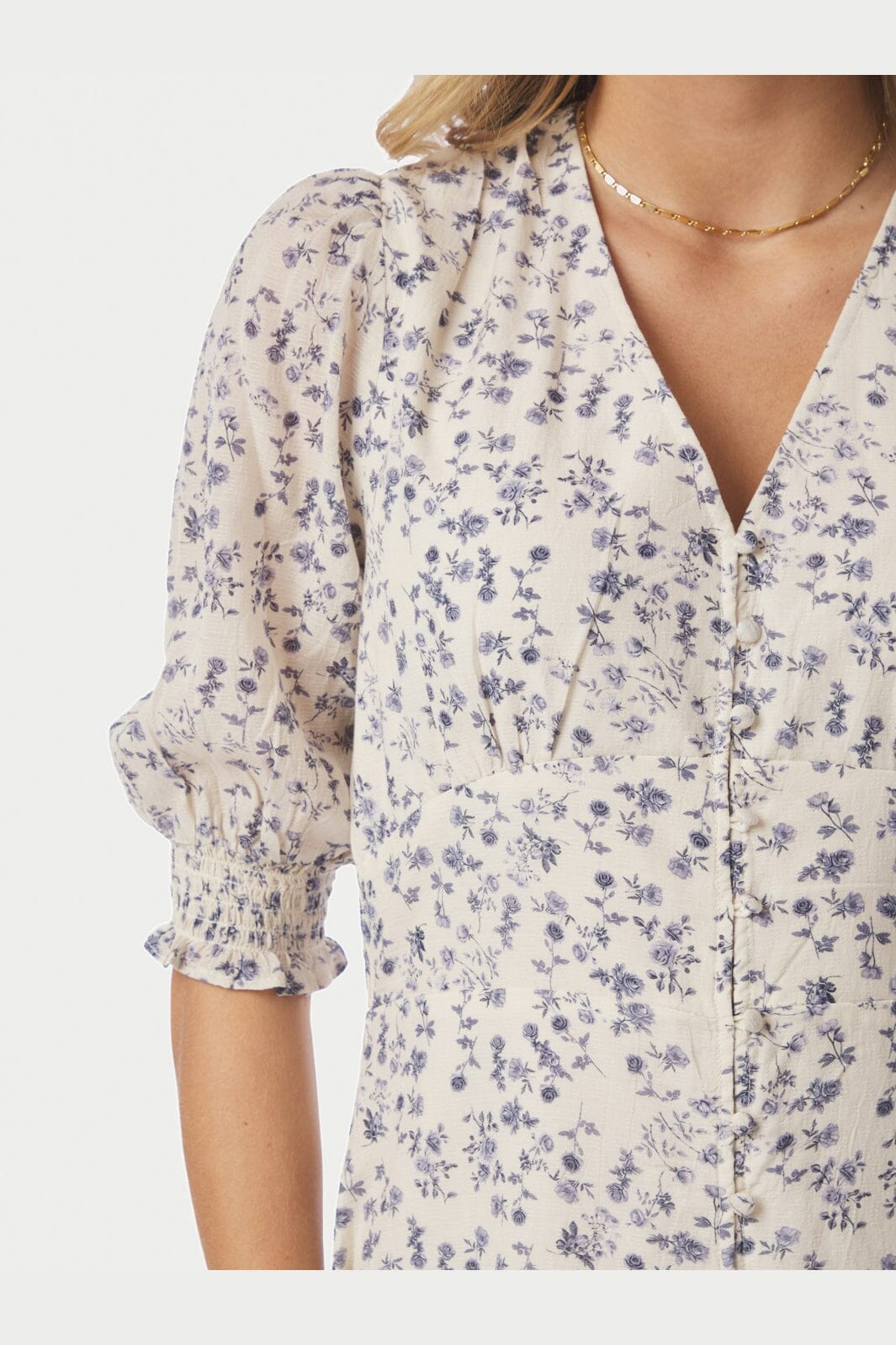 Robe Neo Noir en blanc cassé avec imprimé fleuri. La robe possède des manches bouffantes, un décolleté en V et des boutons sur le devant, avec une coupe classique.