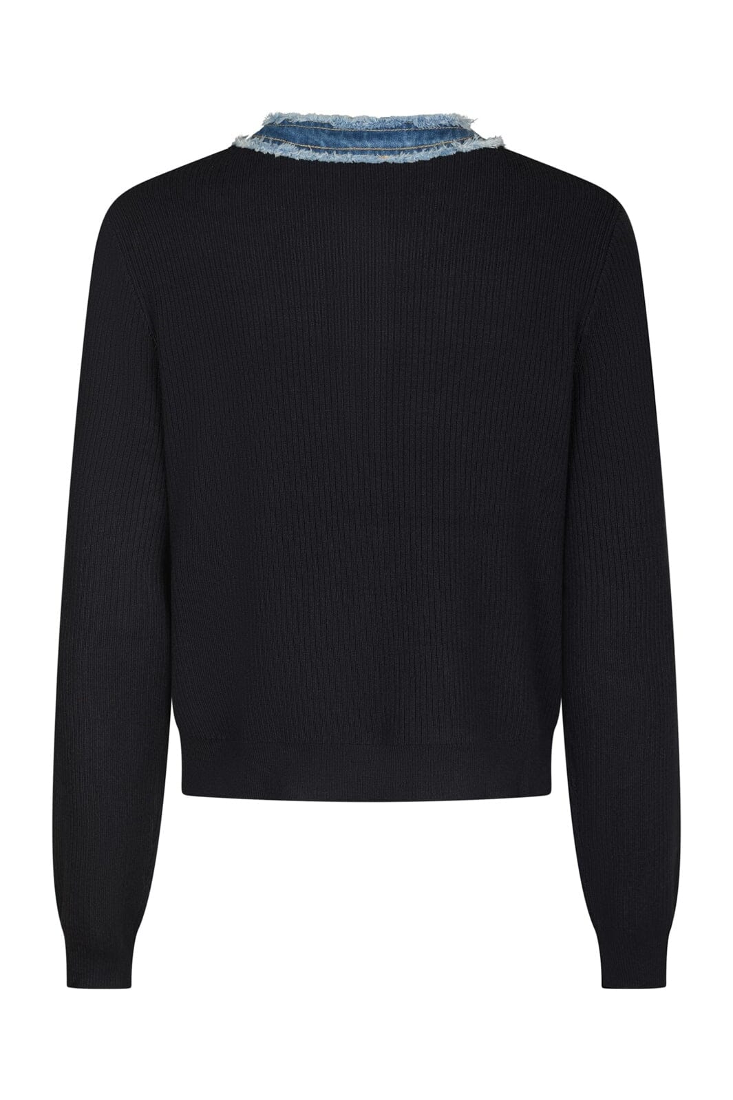 Cardigan en tricot bleu marine de Neo Noir avec des bords en denim au col et aux poches. Le cardigan a des boutons à l'avant et des détails en volants qui apportent une touche douce.