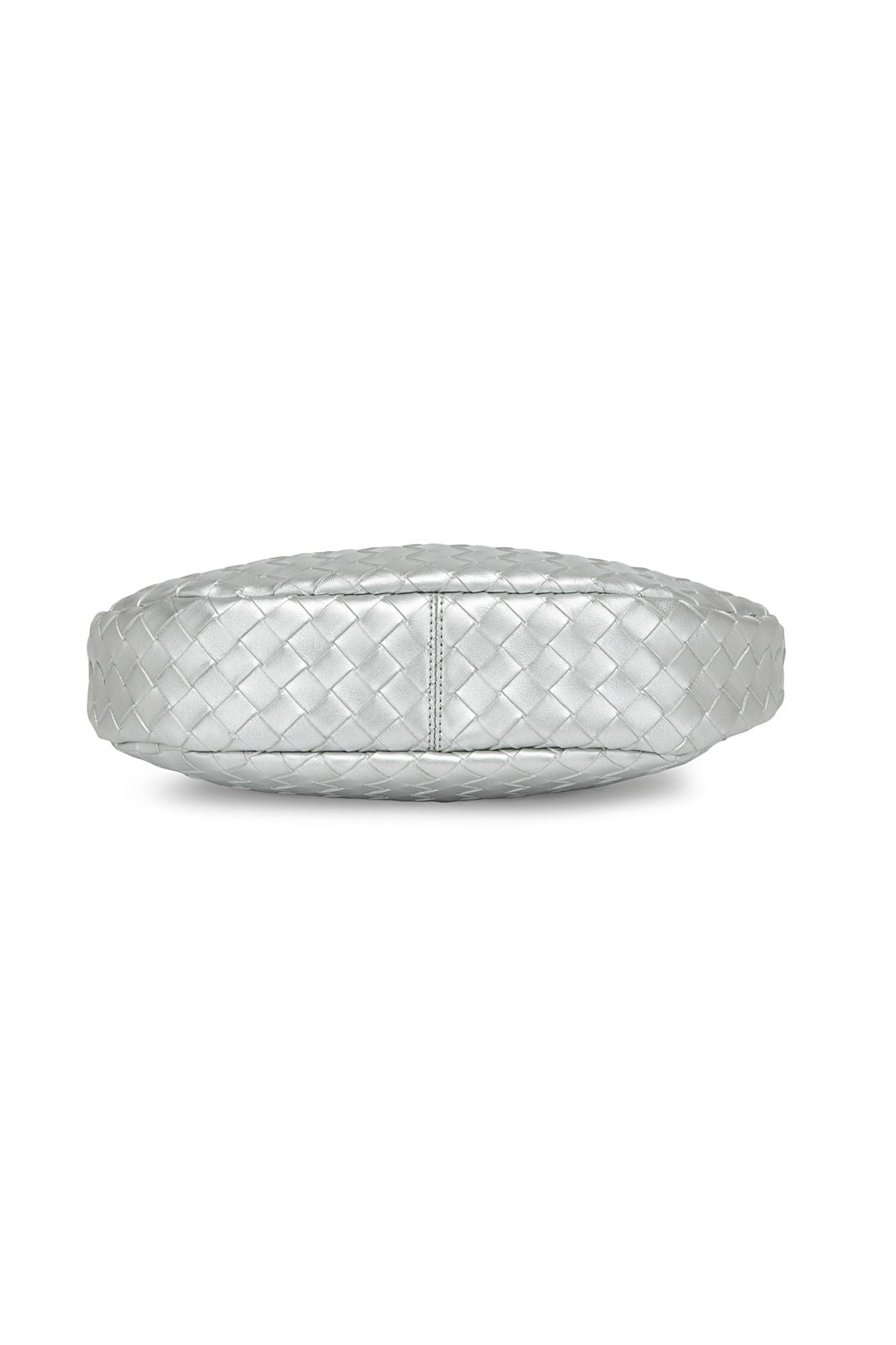 Sac bandoulière argenté de Noella avec texture tissée et forme de demi-lune plate. Le sac est en polyuréthane et présente des détails en argent brossé.