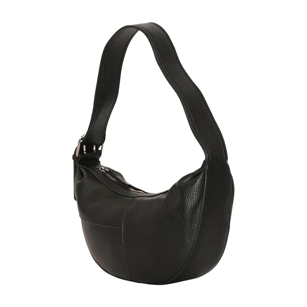 Sac à épaule noir de Noella avec une forme incurvée et une surface texturée. Le sac a une section intérieure spacieuse et une fermeture éclair pratique en haut.